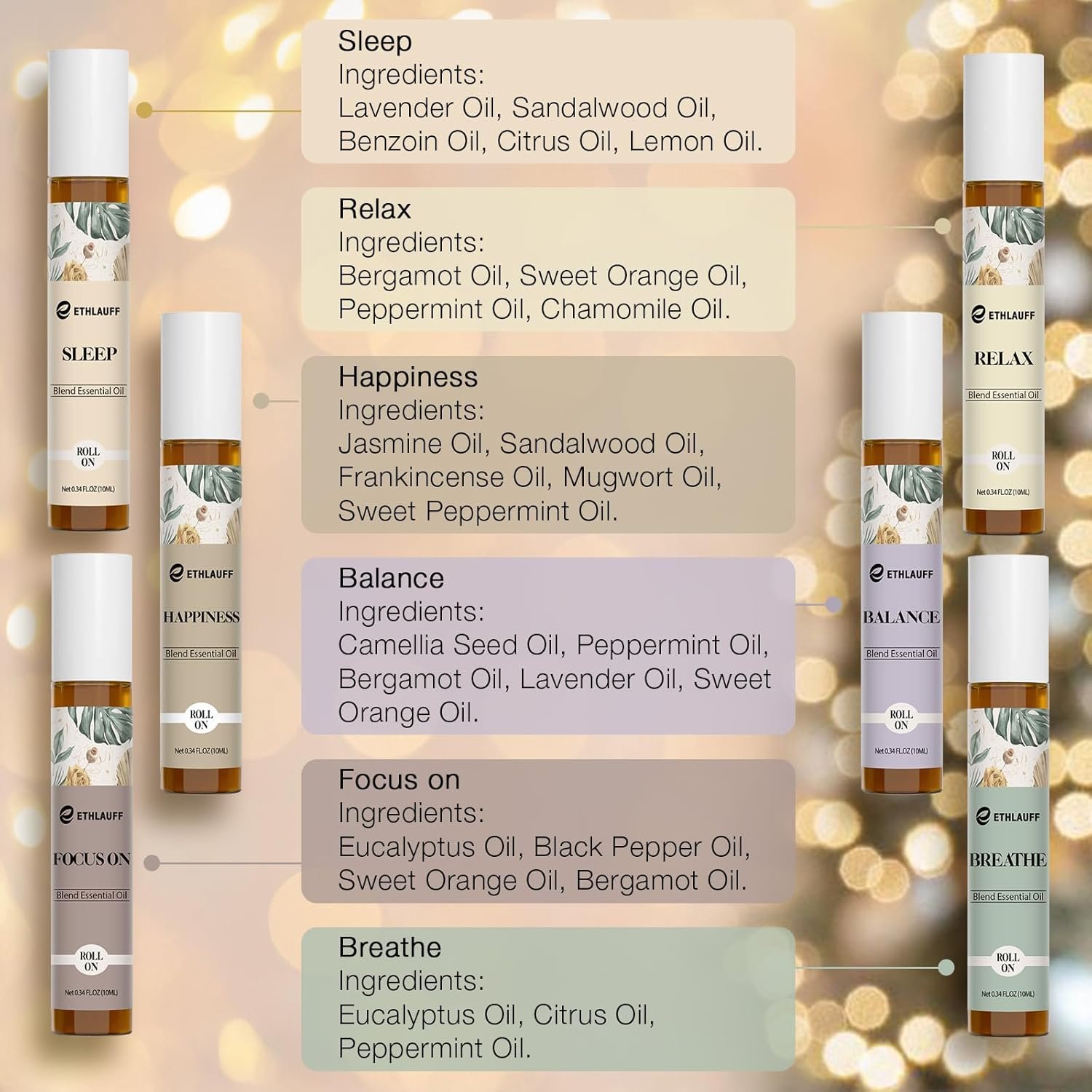 Self Care Gifts for Women & Men: These essential oil perfume set contains 6 * 10 ml pcs, each oil comes with a glass rollerball, easy to carry.With 6 benefits(Relax, Sleep, Balance,Breathe, Focus on, Happiness), there is always one for you. Perfect for refreshing, stress relief, smooth breathing and more.