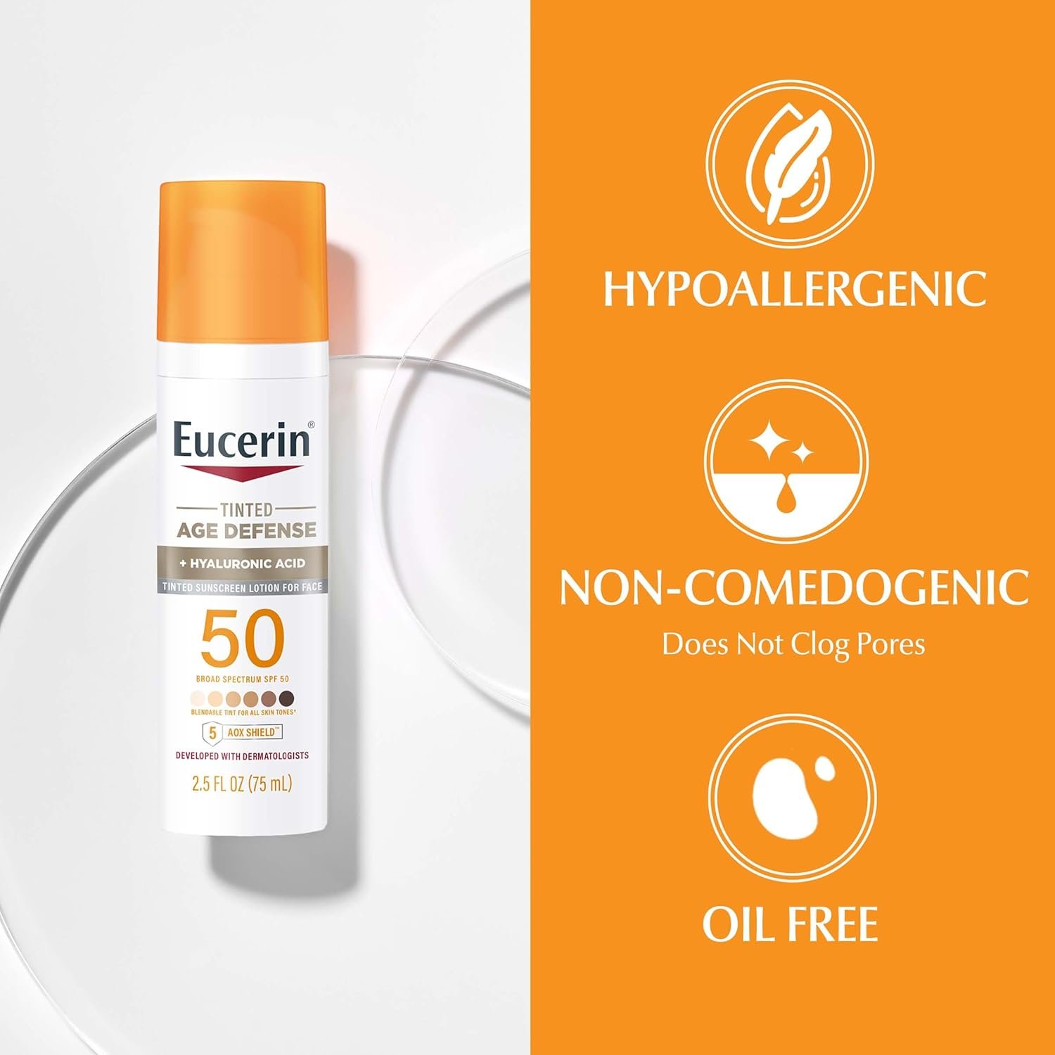 Eucerin Sun Tinted Age Defense SPF 50 Face Sunscreen Lotion is a fragrance free sunscreen with a blendable tint for all skin tones for more even-looking radiant skin. This tinted moisturizing sunscreen is enriched with 5 antioxidants and Hyaluronic Acid, and visibly reduces the look of fine lines and wrinkles.(1) Eucerin Sun Tinted Age Defense SPF 50 Sunscreen features UVA/UVB sun protection plus an Advanced Antioxidant Complex, 5 AOX Shield, and goes beyond neutralizing to also guard from free radicals and help support skin health. This face lotion with SPF 50 layers invisibly under makeup and can be used on its own or as a makeup primer. Eucerin Sun Tinted Age Defense Sunscreen Face Lotion SPF 50 is a non comedogenic sunscreen, so it does not clog pores or cause breakouts. Developed with dermatologists and suitable for sensitive skin, this facial sunscreen SPF 50 is non-irritating to the skin, hypoallergenic, and free of fragrance, dyes, parabens, PABA, phthalates, oxybenzone and octinoxate. Eucerin is a dermatologist-recommended skincare brand that is based on an uncompromising approach to science. (1)with continuous use after 1 week (2)Use as directed with other Sun Protection Measures (See Drug Facts Box)