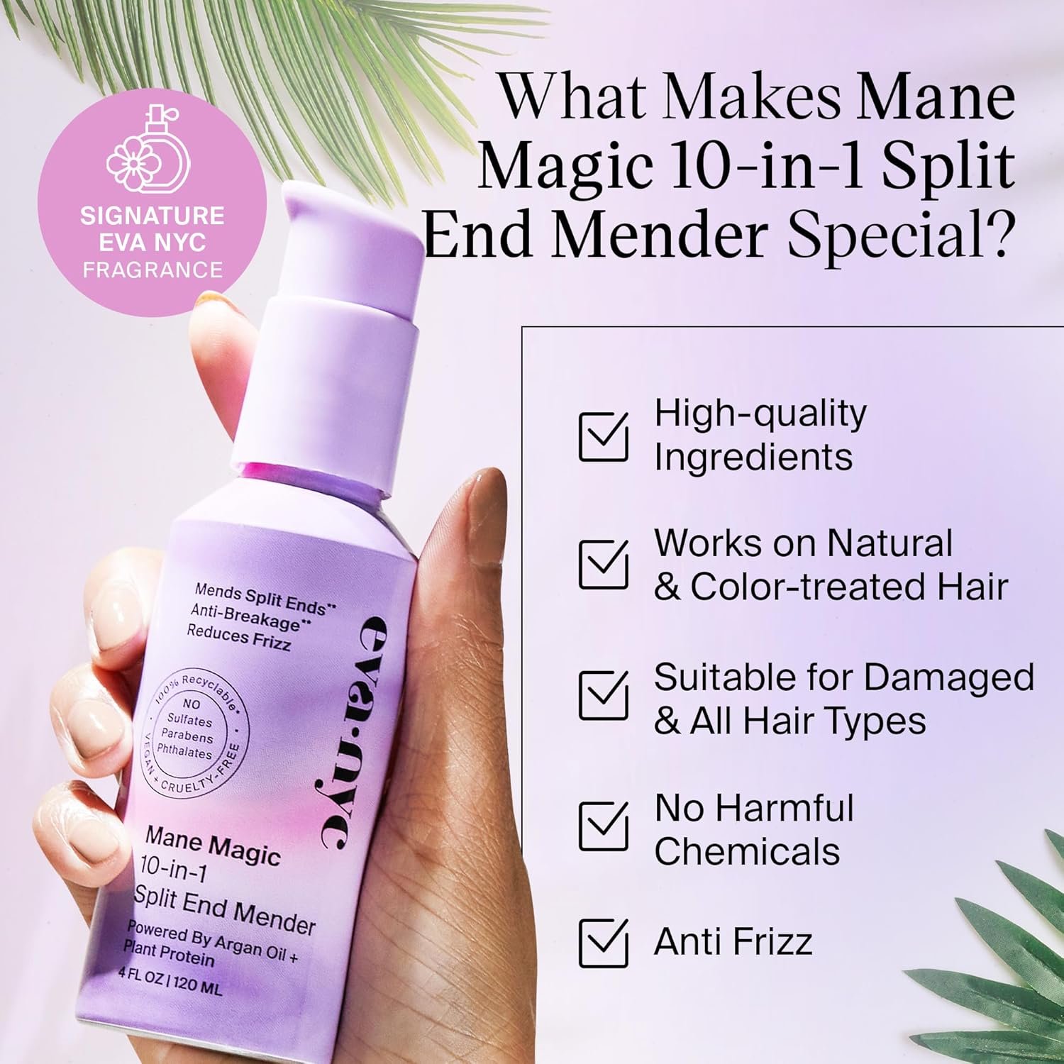 For All Hair Types – Whether you have straight, wavy, or curly hair, Eva NYC Mane Magic 10-in-1 Split End Mender can transform your to shiny, healthy-looking hair. Our split end repair treatment is safe for use on keratin, Brazilian, and color-treated hair without fading color vibrancy.