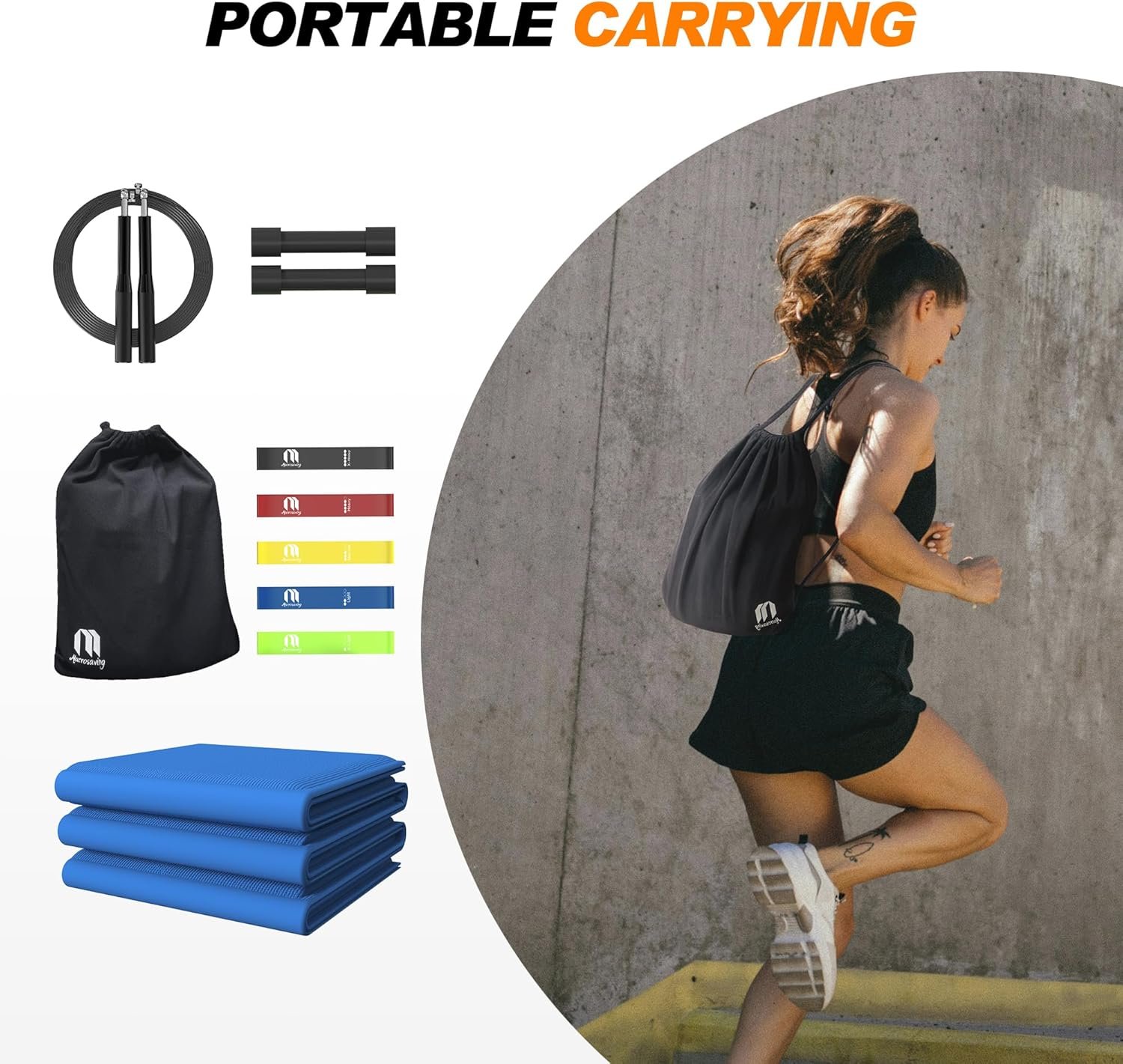 Portable Travel Yoga Mat Set: This yoga mat is foldable and space-saving. Additionally, the kit includes a black storage bag for all your equipment: the yoga mat, dumbbells, exercise bands, and jump rope, ensuring neat storage while traveling