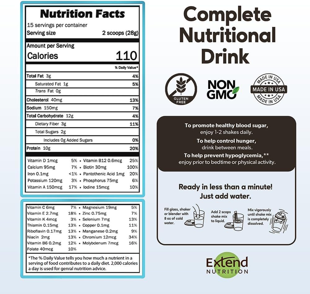 PERFECT DIABETIC MEAL REPLACEMENT OR SNACK: Extend Nutrition’s diabetic protein drinks are the best low sugar diabetic protein powder. Doctors and dieticians recommend these low carb snacks to aid with blood sugar support, which helps reduce blood sugar swings and lower episodes of hypoglycemia and hyperglycemia.