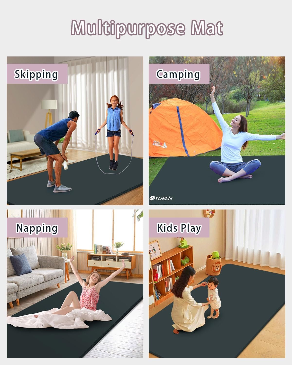 Large Exercise Mat 6×4 Ft: Our large mat can transform any room in your home into your own home gym. Its spacious is large enough for any yoga pose, meditation, stretching, light cardio workout or barefoot bodyweight exercises, as welll as kids play mat. Note: Same quality mats with different Logo (“YRYUREN” or “YR”) will send out randomly.