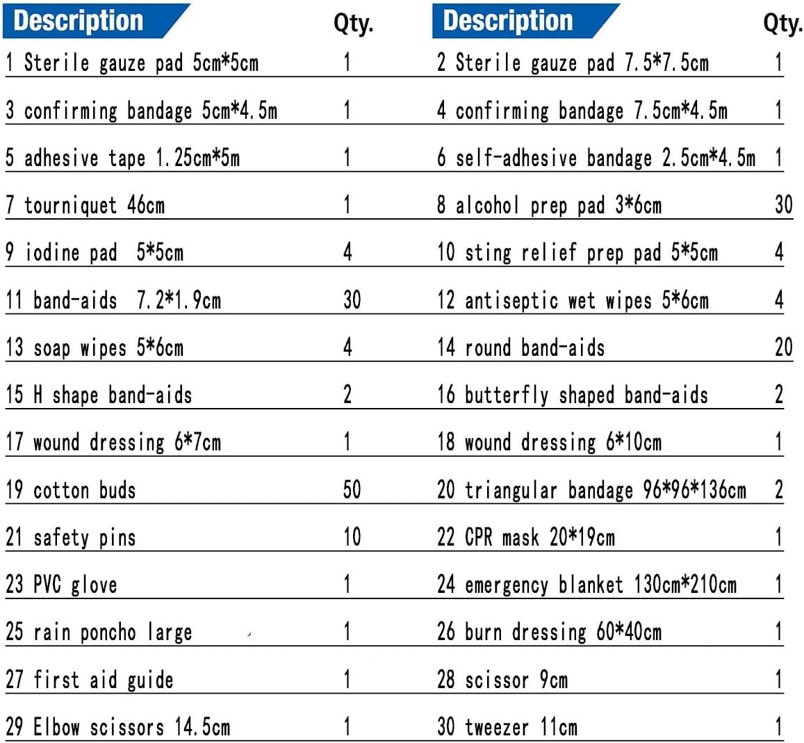 The first aid kit includes 30 sets of 180 pieces of basic first aid supplies for the treatment of minor pains and injuries, among which a first aid guide can help you manage first aid correctly in various emergency situations.
