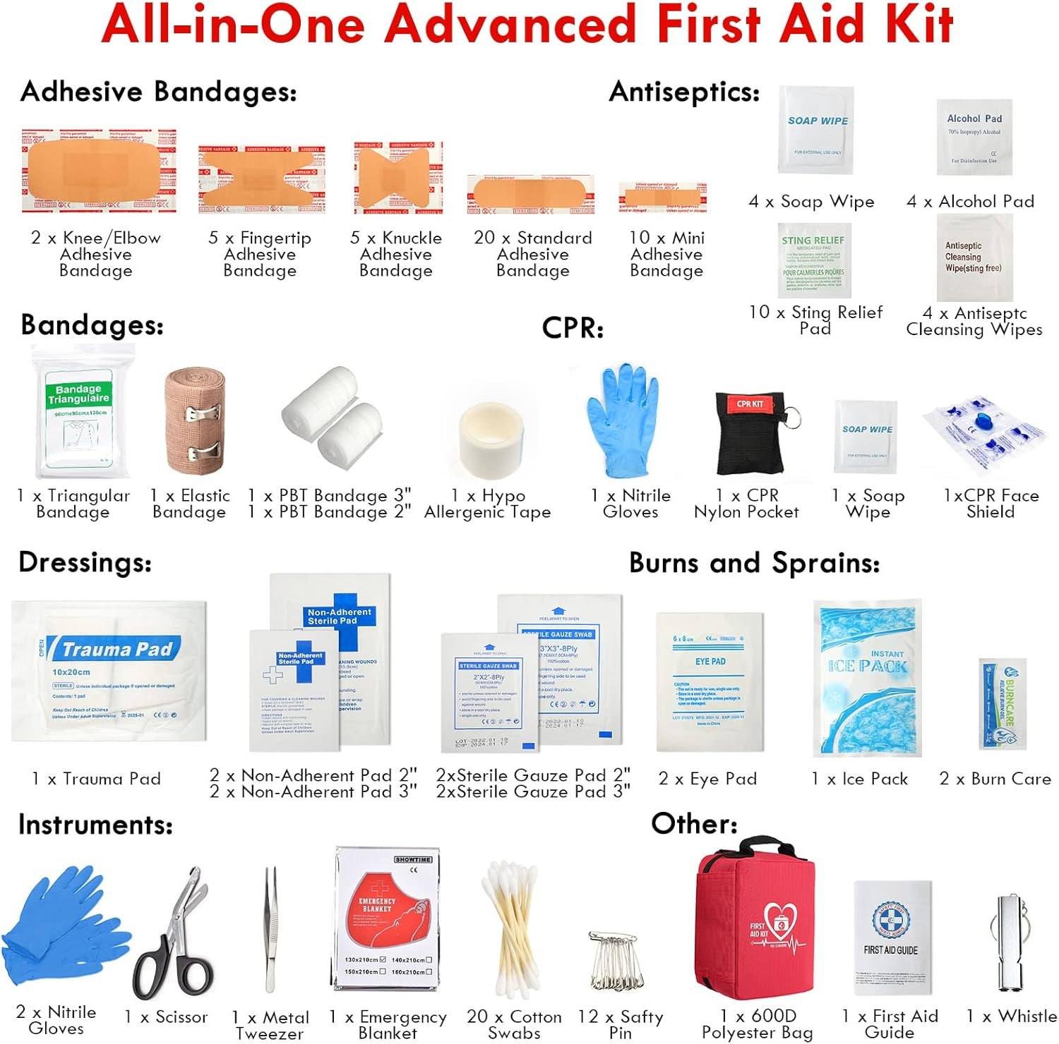 【Comprehensive First Aid Supplies】This trauma first aid kit contains a complete set of first aid treatment products. Please see the product images and description below for a full list of contents. It’s ideal for home, workplace, outdoors, travel, boating, camping, hiking, and any kind of emergency situation.