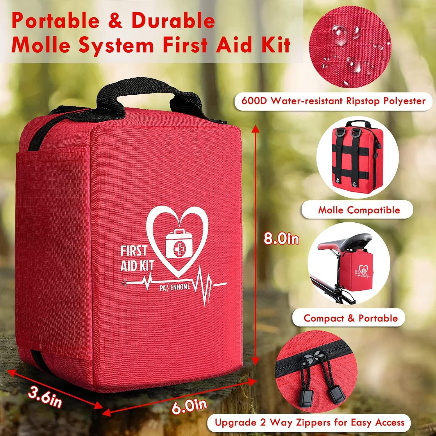 【Compact Design, Additional Space】This first aid bag is easy to carry with an overall dimension of 7.9” x 5.9” x 3.6” and a weight of only 1.3 lbs. It can be stored in your home med cabinet, car, college dorm room, RV, or attached to a bike or motorcycle. The additional space allows you to add custom items if needed.