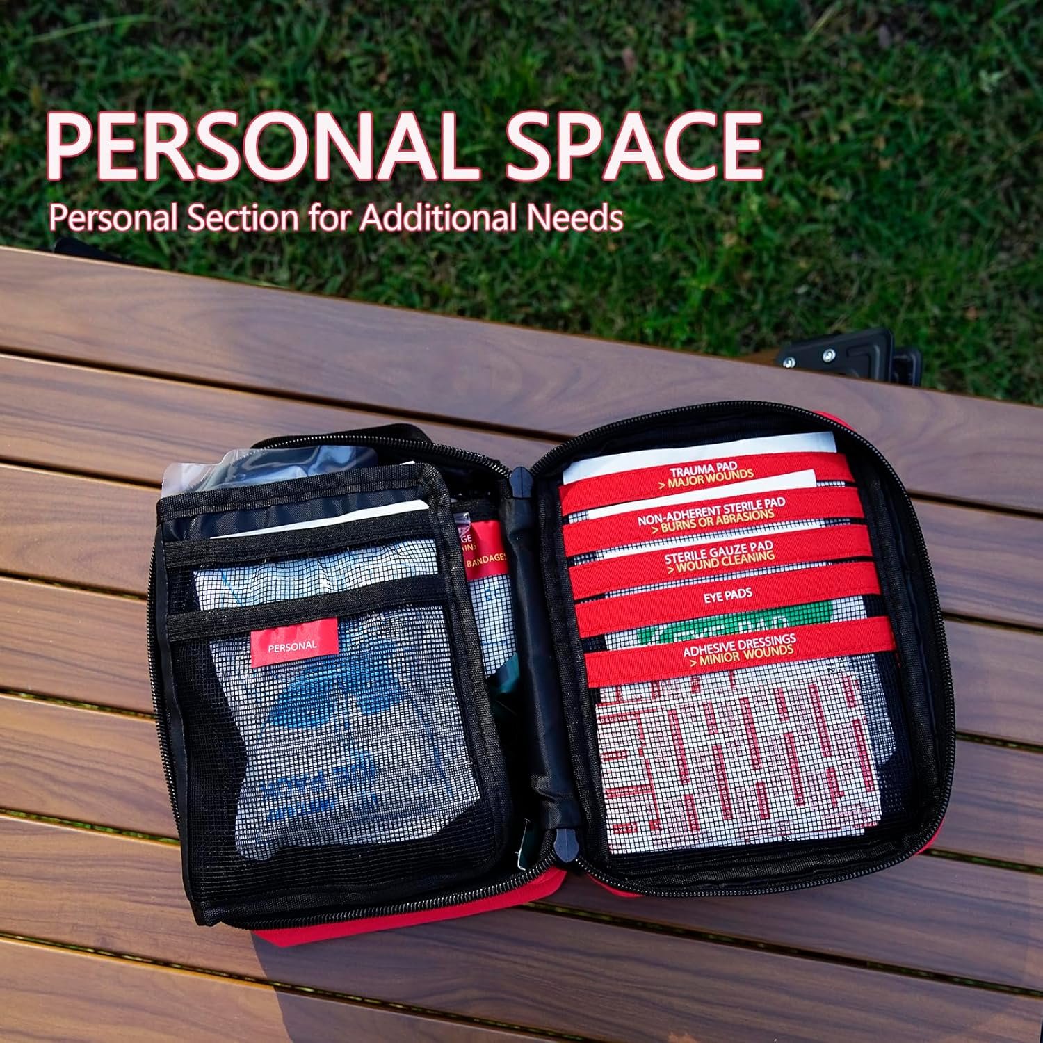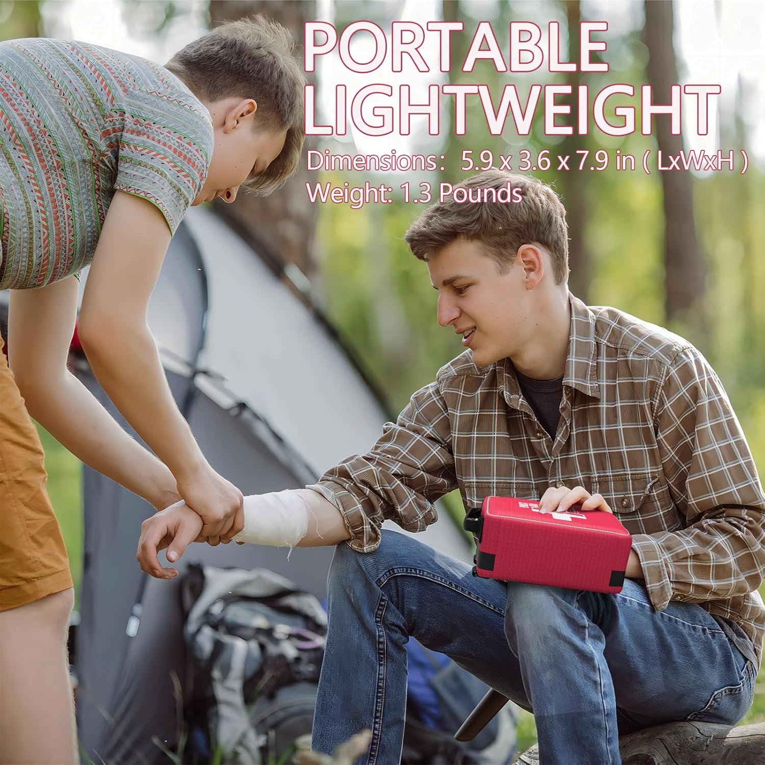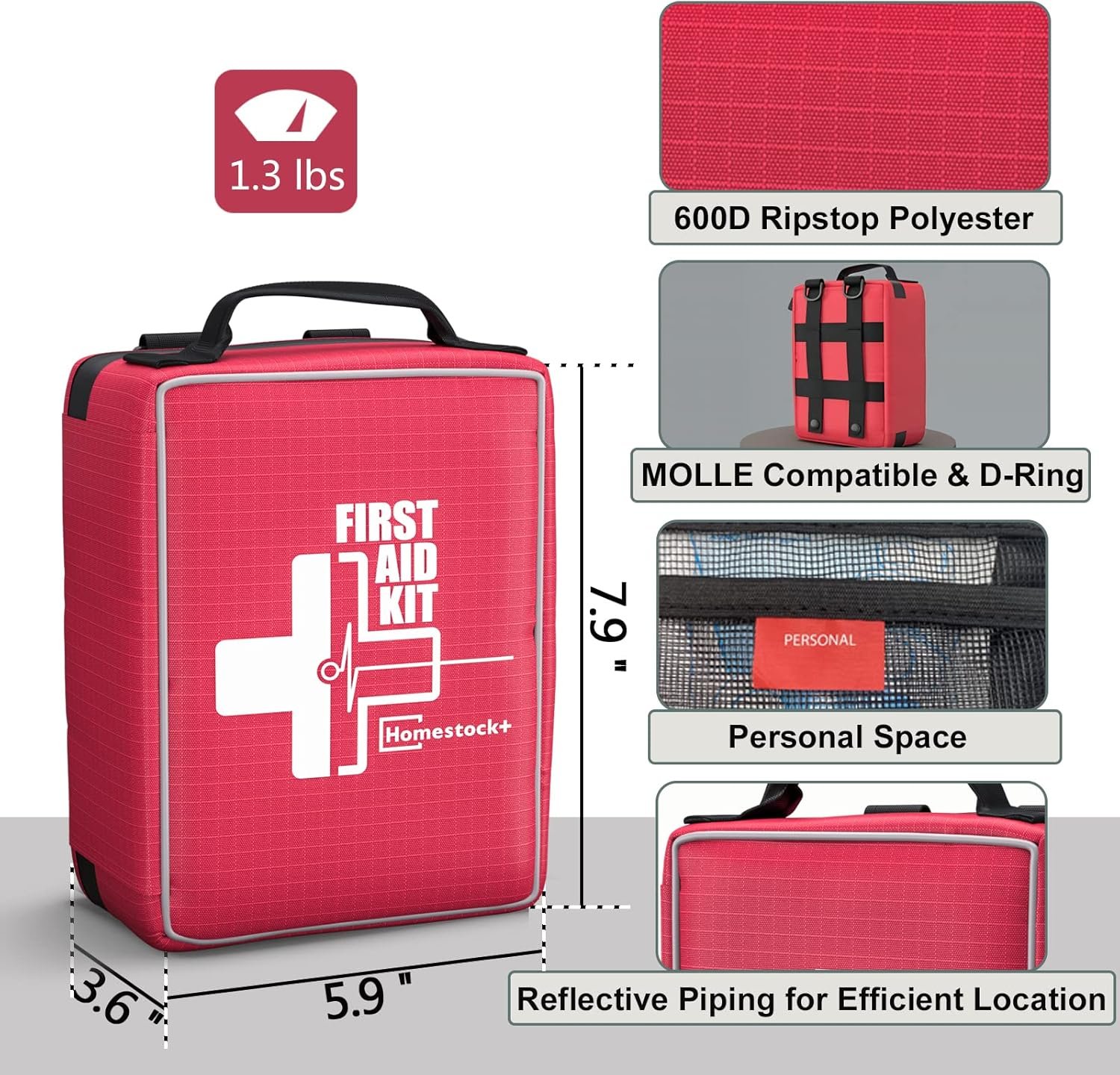 Compact and Portable:The overall dimension of the compact first aid kit is 7.9 ” x 5.9 ” x 3.6 ” and weight only 1.3 lbs,it is ideal for an active lifestyle.Thoughtfully designed. Portability design makes this a “to go-anywhere” type of first aid kit