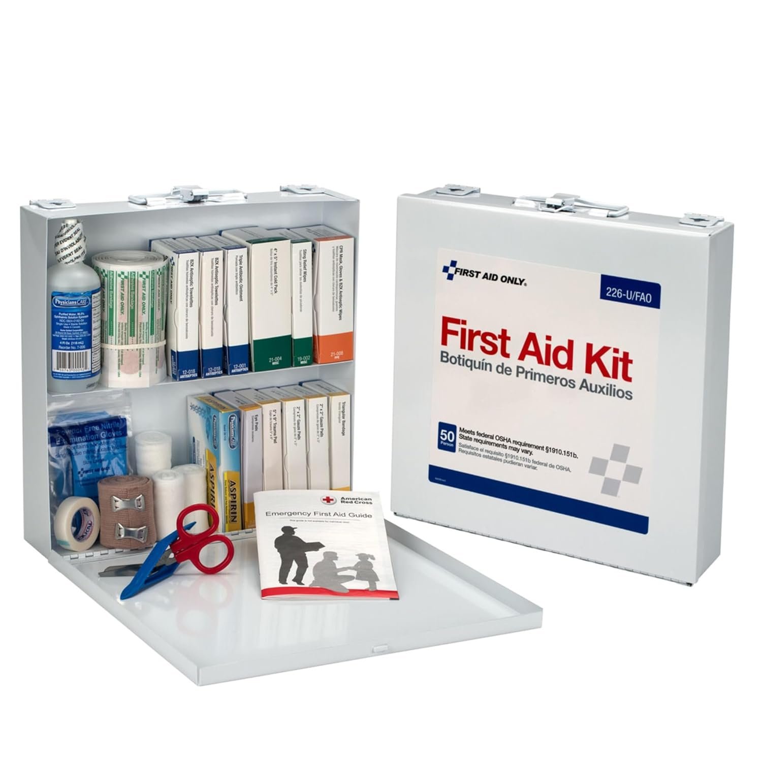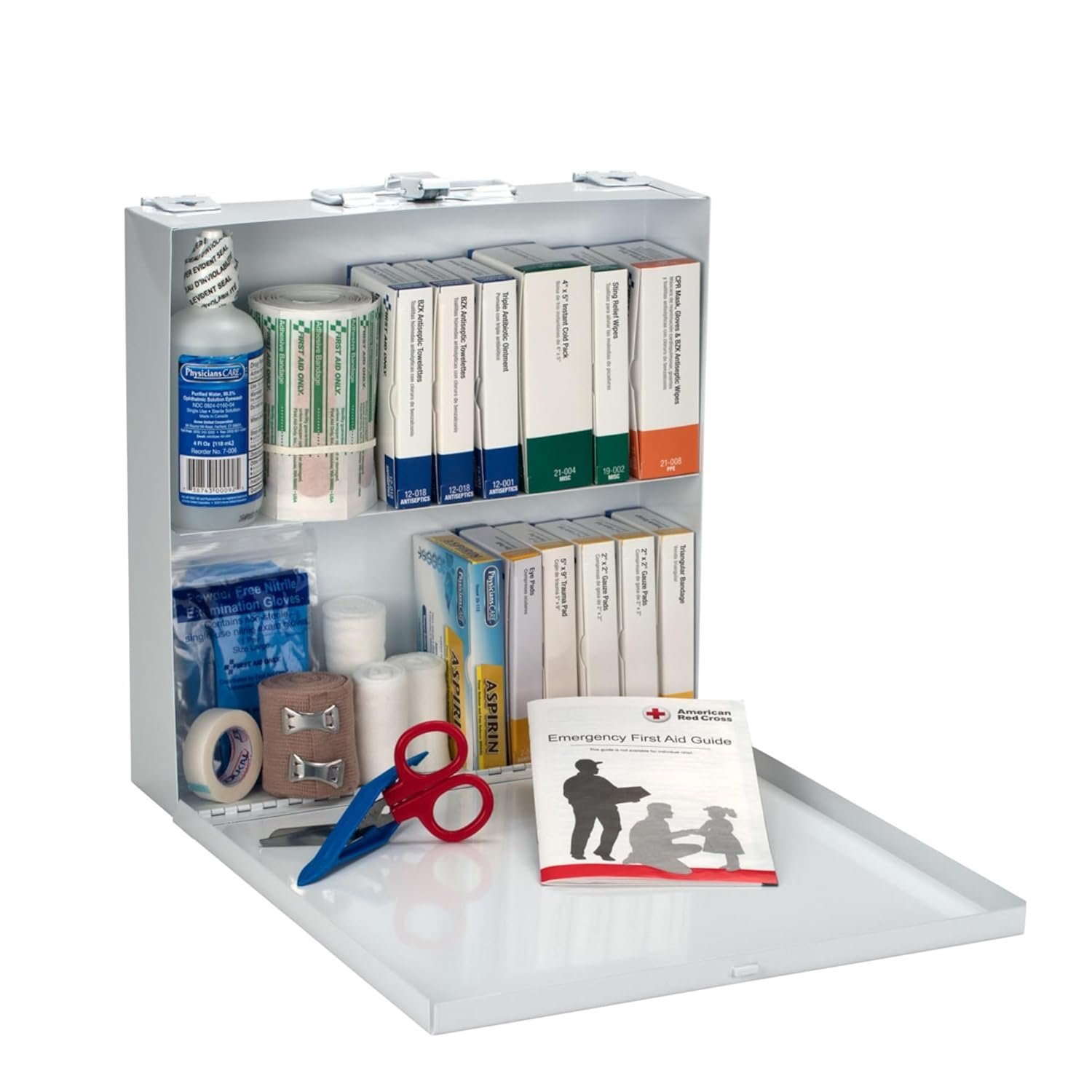 Convenient Packaging: An ideal worksite or office first aid kit, this set of first aid supplies features a durable, wall-mountable metal case with an easy-to-carry handle and unitized boxes with ANSI-compliant color coding