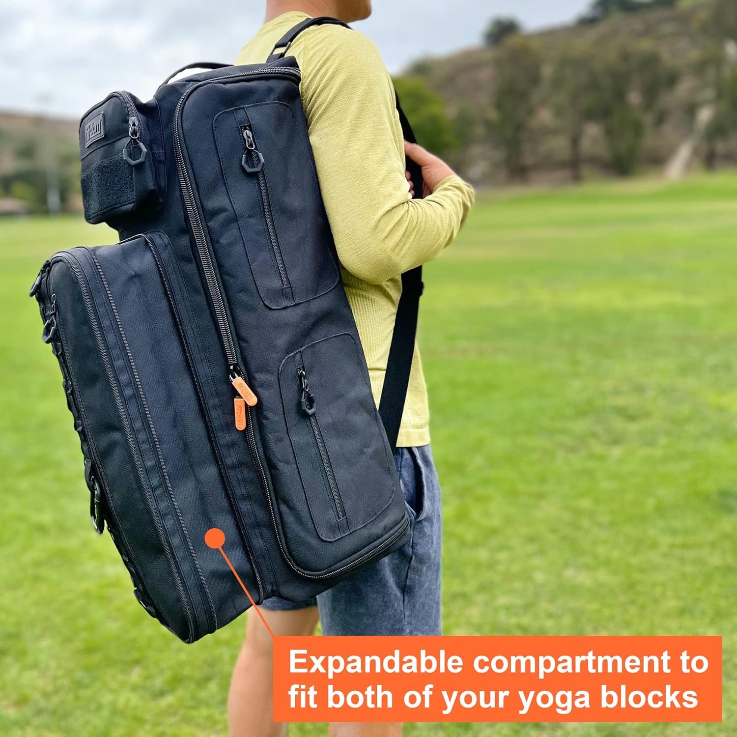 Expandable Yoga Mat Carrier – Our yoga mat carrier bag is designed with an expandable compartment, allowing you to effortlessly fit two yoga blocks, perfect for enhancing your yoga experience.