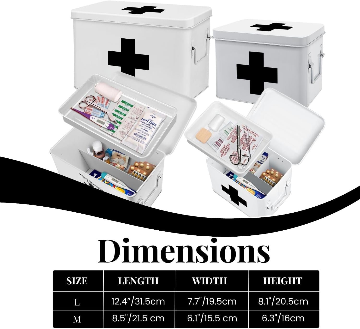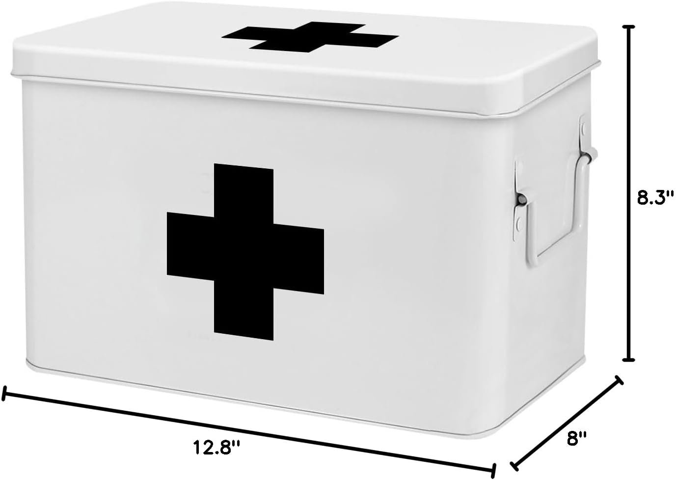 - 1x First Aid Box Organizer – Empty 13″ White Vintage First Aid Kit Tin Metal Medical Box – First Aid Storage Box Container Bins with Dividers, Removable Tray and Black Cross Logo