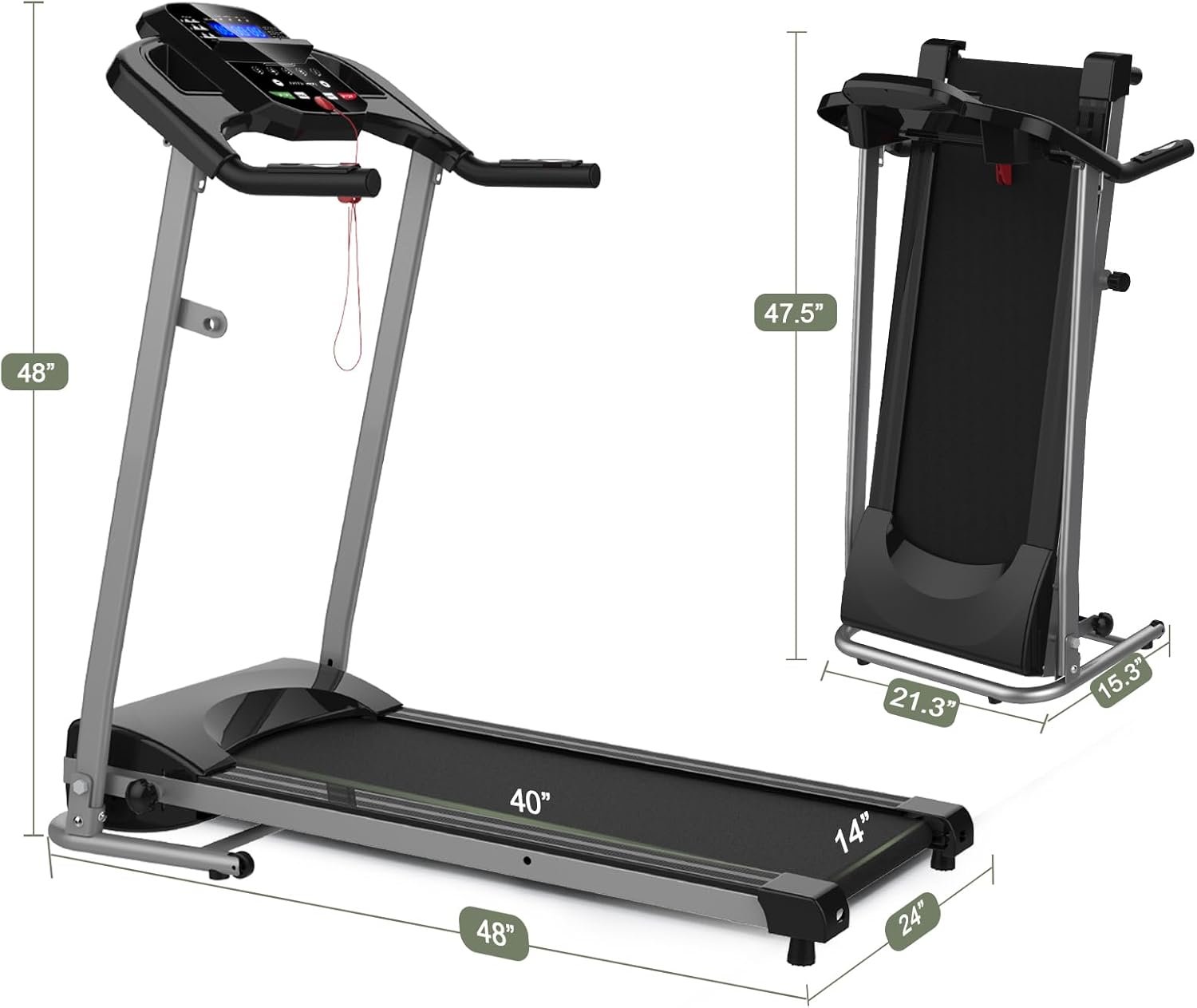 Product InformationItem Code:W98751380Product Type:General ItemProduct Name:Foldable Electric Treadmill 2.5HP Motorized Running Machine with 12 Perset Programs 265LBS Weight Capacity Walking Jogging TreadmillMain Color:BlackMain Material:SteelProduct DimensionsAssembled Length (in.):48.00Assembled Width (in.):24.00Assembled Height (in.):48.00Weight (lbs.):52.80Package SizeLength (in.):52.00Width (in.):27.50Height (in.):9.40Weight (lbs.):70.00