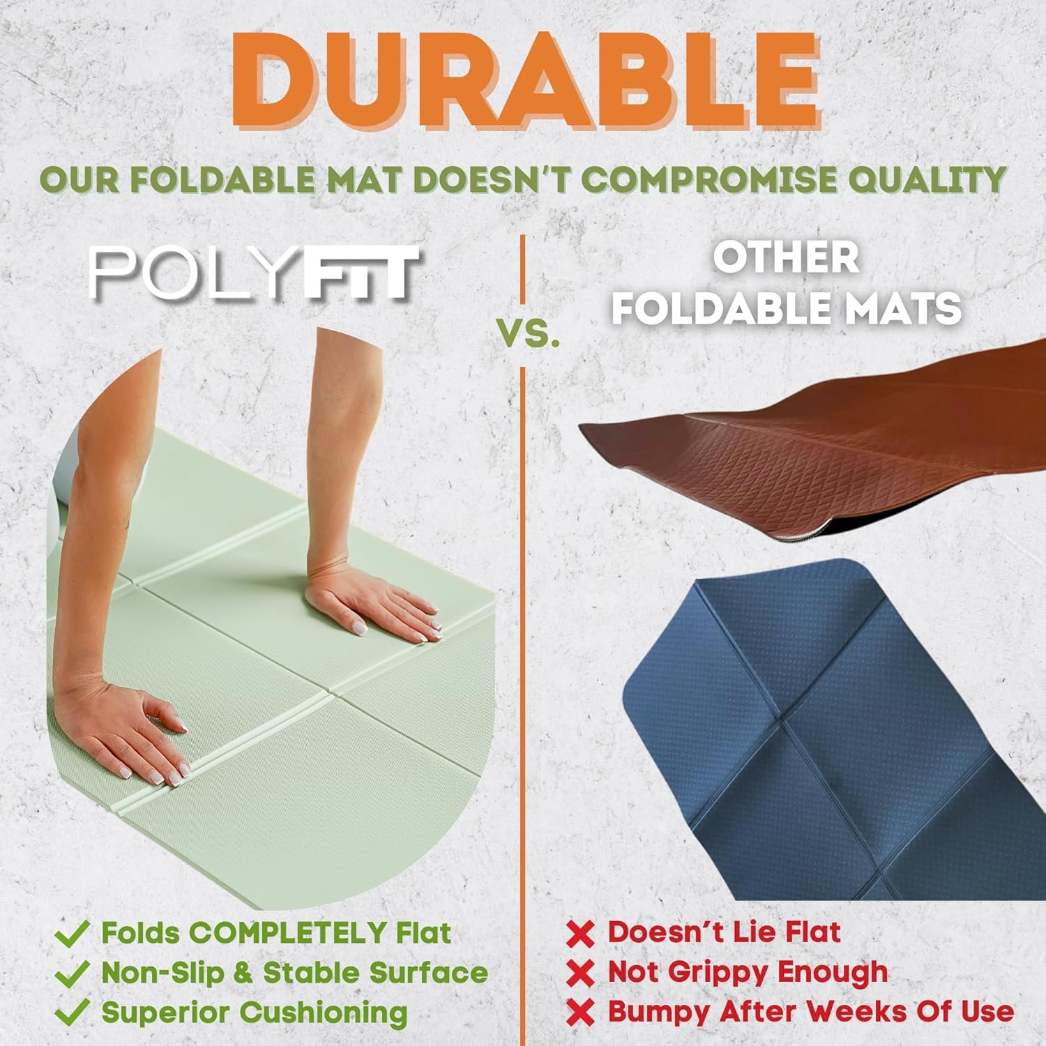 【LIGHTWEIGHT & PORTABLE】Foldable and perfect for travel, this yoga mat is easy to carry wherever you go. Plus, a free carry bag is included for added convenience!