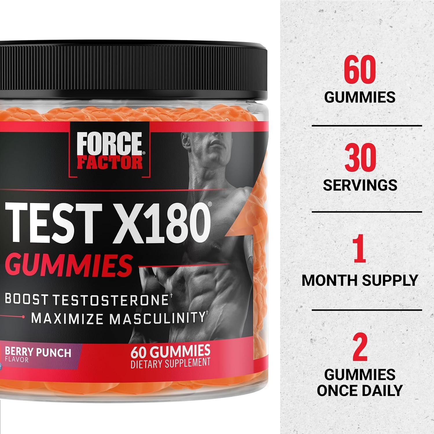 Shrinking testosterone levels affect almost all men after the age of 30. That’s when your masculinity can begin to fade, sometimes leading to a low-confidence, low-energy lifestyle. Don’t let it happen to you – especially when you can do something about it! Test X180 Gummies are revolutionizing the supplement industry, providing a completely new and convenient way for men to boost testosterone for maximum masculinity and performance. The testosterone supplement experts at Force Factor have harnessed decades of research to create Test X180 Gummies. This incredible testosterone booster is loaded with advanced ingredients like boron, fenugreek, black maca, Tribulus terrestris, tongkat ali, and horny goat weed, traditionally used to boost testosterone and support men’s health. If you’re an active guy who prioritizes the way he looks, feels, and performs, add Test X180 Gummies to your routine today.