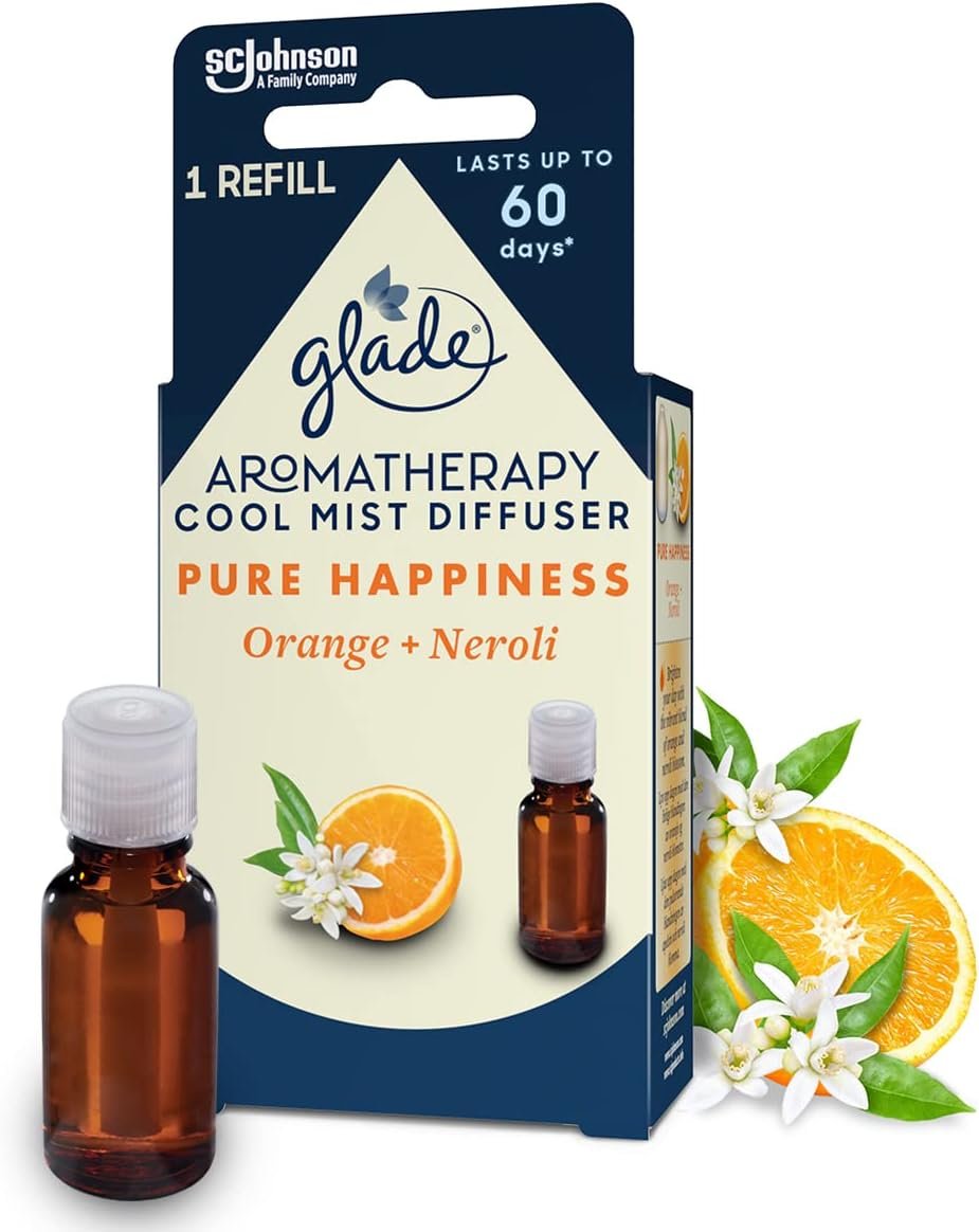 Brighten the mood with Glade Aromatherapy Cool Mist Diffuser Refill. Energize the atmosphere with a dual blend of essential oil-infused fragrance and enjoy the Pure Happiness. This aroma diffuser refill uses essential oils that are traced to the countries of origin. Own the mood with the blend of Brazilian Orange and North African Neroli blossom. Glade air freshener refill is consciously crafted for a life in balance, made without parabens, phthalates, nitro musks, artificial colors or dyes. Our room air freshener refill is a treat for your senses. When used with the Glade Aromatherapy Cool Mist Diffuser, it helps to relax yourself with air. There’s no mixing or mess, as the easy one-click diffuser refills are preblended and simple to insert into the device, while dual-wick technology ensures consistent performance for up to 60 days*. *on low setting