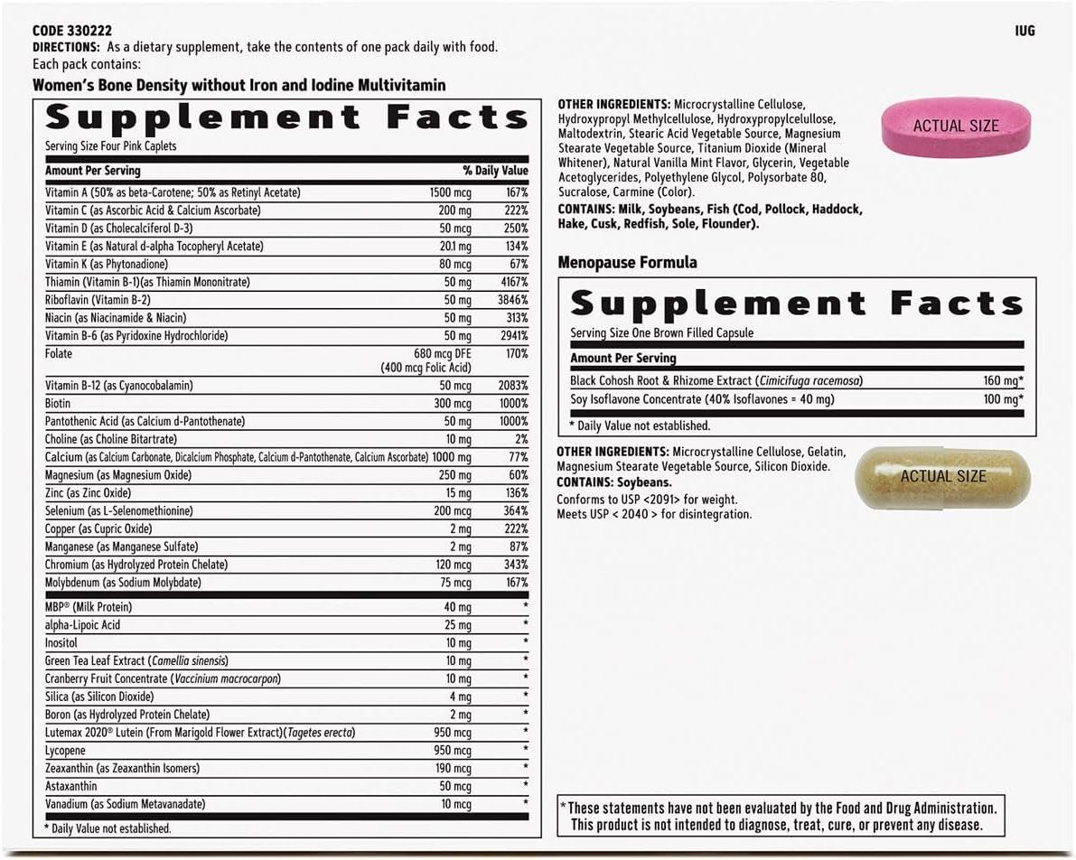 Menopause Support – Includes black cohosh, traditionally used to address symptoms during menopause; soy isoflavones, which may have a mild estrogenic effect; and evening primrose oil, which may help with hormonal balance*Bone Health – Features MBP, which is clinically studied to support the body’s natural ability to build and maintain healthy bones*Cardiovascular Health – Omega-3s from fish oil and GLA from evening primrose oil help support healthy blood lipids and cardiovascular health*Antioxidants – Help protect against free radicals that can destroy healthy cells and promote the cell-aging process*