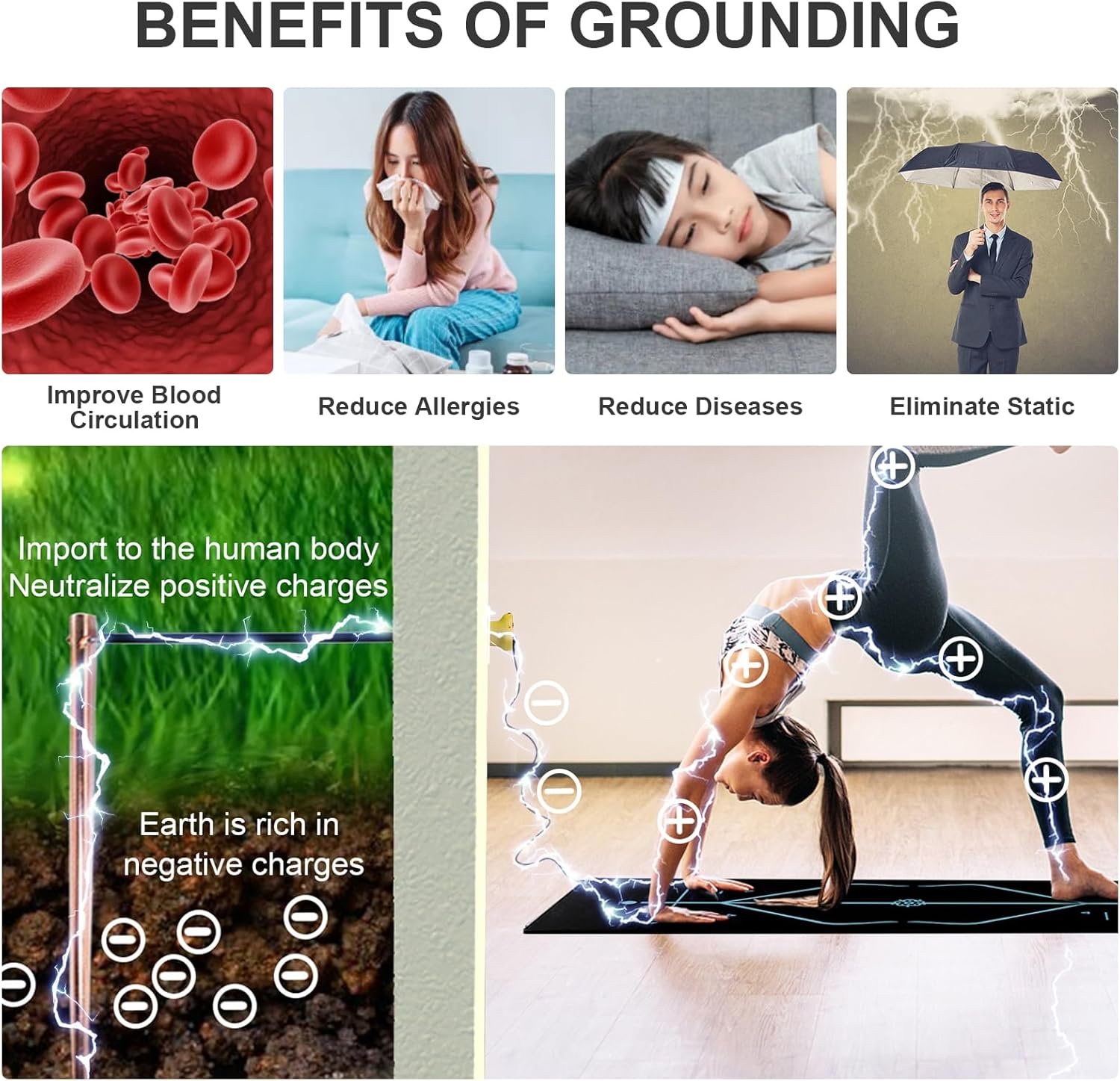 【What is Grounding】When you walk barefoot on the earth. The earth’s electrons (negative charges) flow into your body to eliminate Electro-Static (Positive charges). If the Electro-Static can’t be eliminated for a long time, it makes irritable, affects our sleep, causes different kinds of inflammation. That’s why Grounding is very good for healthy.