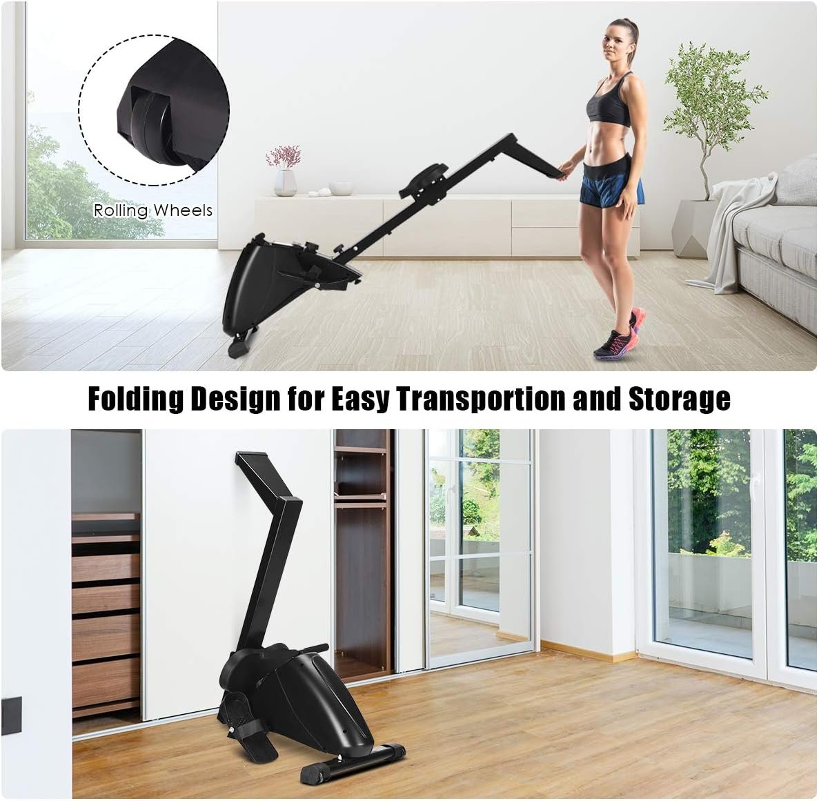 【Folded Design to Save Space】The portable rowing machine can be folded vertically. Transportation wheels make it easy to move anywhere effortlessly. What’s more, it will not take up too much space after being folded and is very suitable for your home.