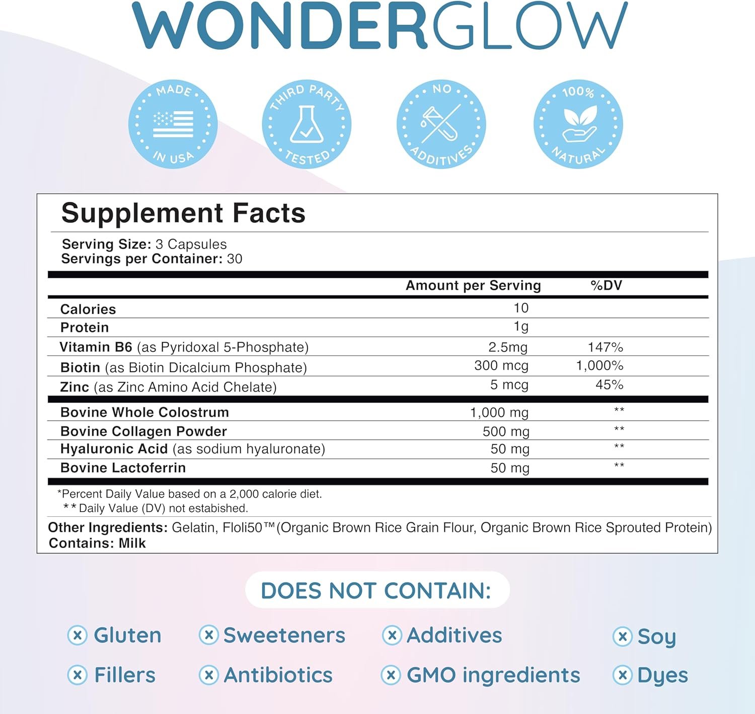 HOW TO USE: Take three (3) capsules daily with 8 oz of water. WonderGlow is your simple, everyday solution for supporting hair health, glowing skin, and nail strength. Made with clean, non-GMO ingredients in the USA, WonderCow prioritizes third-party testing for heavy metals to provide you with trustworthy health solutions.