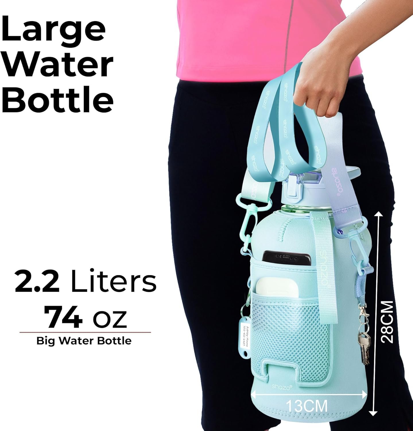 Durable and Reliable Hydration : with the Shazo 1/2 Gallon Water Bottle. 74 oz capacity the water bottle is crafted with superior quality and reliability. This water bottle is the perfect hydration solution for men and women. Whether you’re at the gym, on a run, or hitting the trails, its lightweight design and leak-proof capabilities ensure that your drink will stay secure and your belongings protected.