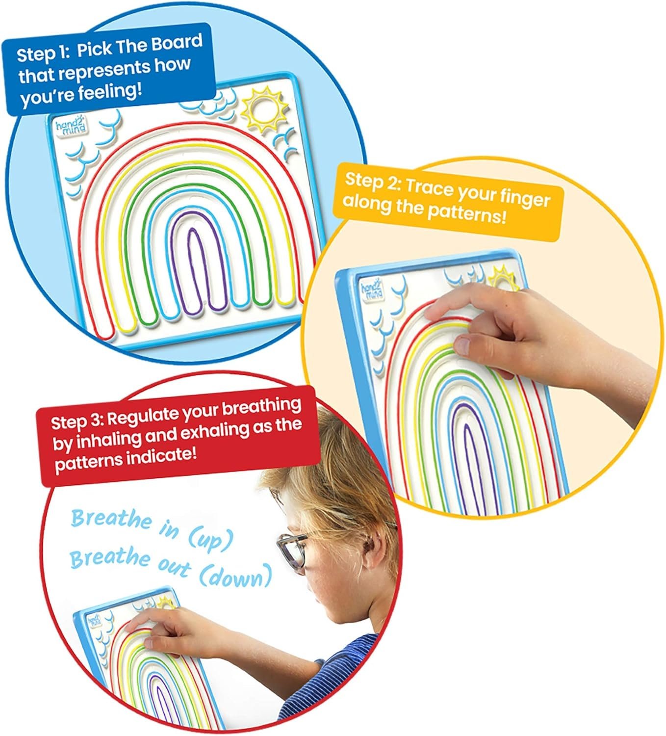 Help children focus on and refine fine motor skills with calming breathing boards! Our Mindful Maze Set helps children focus on their breath through guided prompts and breathing activities. This set includes 3 double-sided Mindful Maze boards with indented finger paths. The unique, calming exercises on each board are easy to follow and use tactile prompts for inhaling, exhaling, and pausing. The engaging design of each board will guide children through the breath pattern and help them practice self-management and mindfulness. Children will trace the design with their finger, breathing in and out as directed by the design of the board. These calming breath patterns will help children become resilient learners who respond positively to any challenge. It’s a great way to incorporate mindfulness and social emotional learning into a child’s daily routine. Each board features beginner breath patterns on the front (Cooling Breath, Star Breath, Square Breath) and advanced breath patterns on the back (Steady State Breath, Rainbow Breath, Laddered Breath). Great as a quiet, individual activity that encourages children to practice mindfulness, attention, and emotional control. The included guide includes expert tips for getting started with social-emotional learning in any setting. For over 55 years, hand2mind has encouraged hands-on learning and discovery, driving deeper understanding and helping children unlock their full potential. hand2mind is a pioneer in social emotional learning products that help build mindfulness for kids as well as how to deal with their own emotions. From kindergarten to middle school, hand2mind has you covered with products designed to enhance learning in the classroom and the world around us. Through innovation and creation, we strive to find new ways to encourage students in math practice, literacy activities, STEM education, Social Emotional Learning, and more!