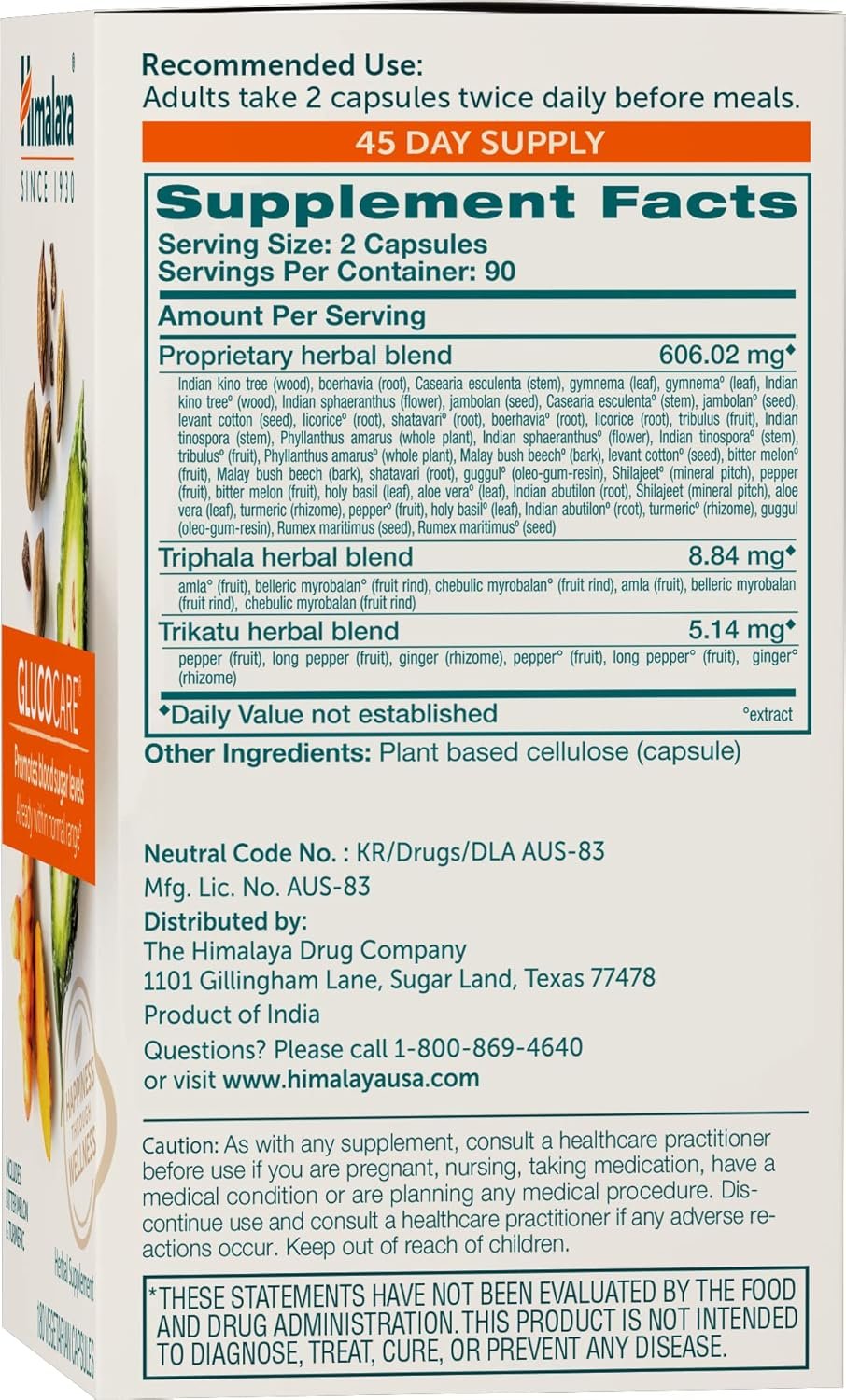 Metabolism and Wellness Support: Himalaya GlucoCare is a daily herbal supplement formulated to support metabolism.* Take 2 capsules twice daily before meals.