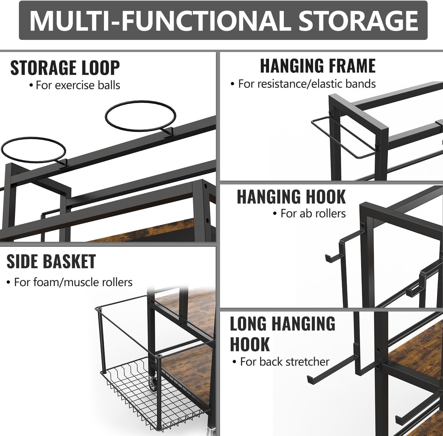 Four-Layer All-Purpose Rack: Featuring four spacious layers, this gym organizer has two loops on the top layer to store yoga/exercise balls. The rack has eight storage areas to accommodate different-sized items and make sure all your equipments well-organized,giving you a nice neat cornor and say goodbye to clutter.