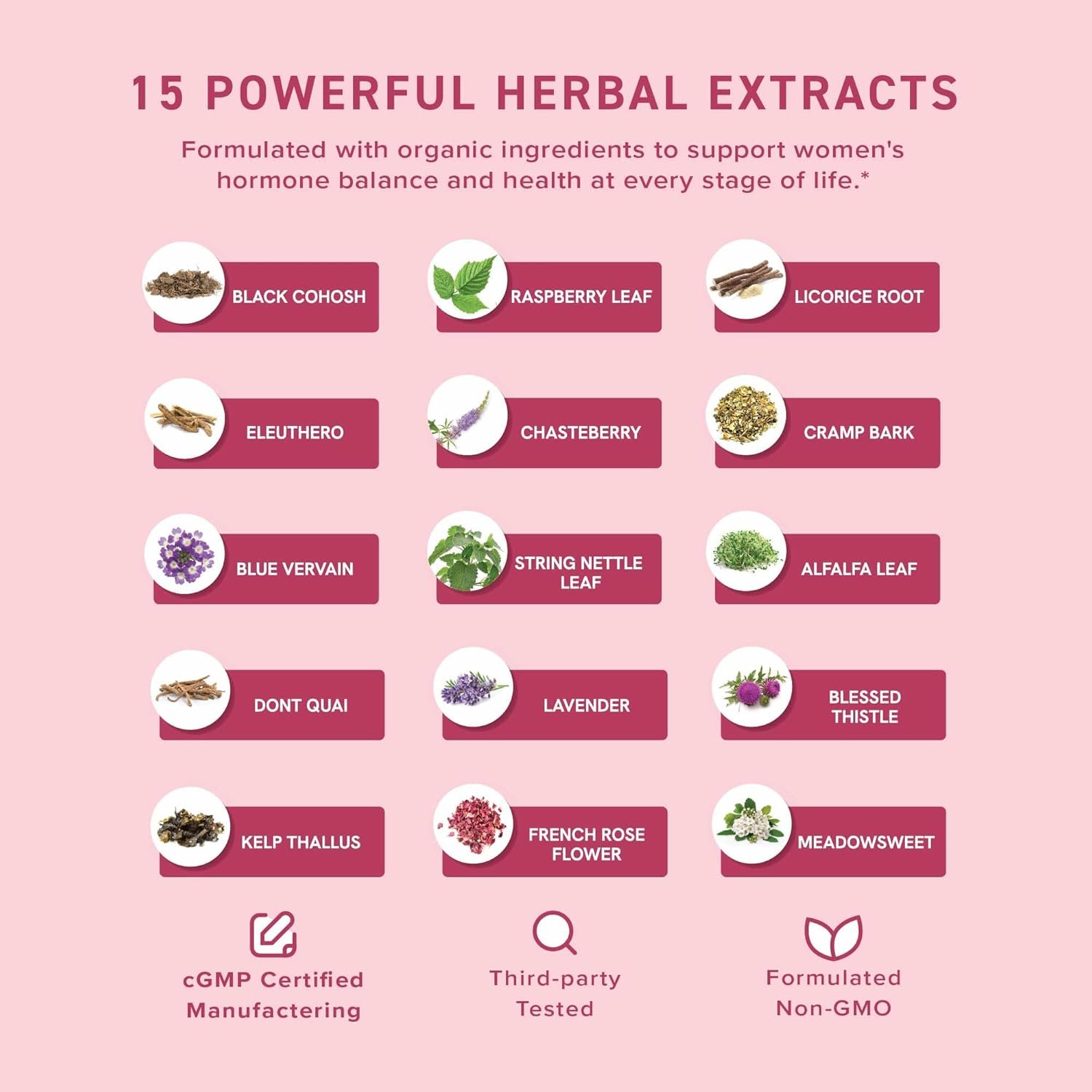 ORGANIC LIQUID EXTRACTS: The organic herbal extract blend in this hormone balance supplement tincture includes Stinging Nettle Leaf, Red Raspberry, Eleuthero, Dong Quai, Licorice, Meadowsweet, French Rose, Black Cohosh, Chasteberry, Cramp Bark, Lavender, Blue Vervain and more.