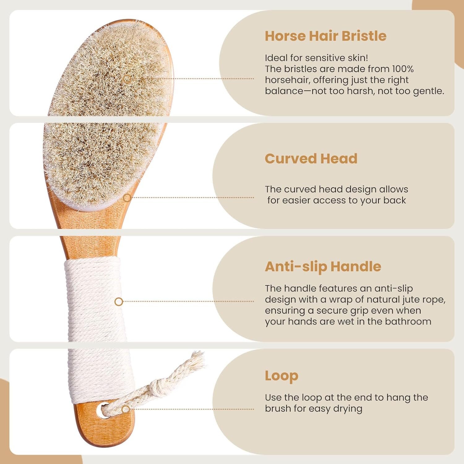 [Horsehair Dry Brush]: Perfect for all skin types, including sensitive skin! The natural horsehair bristles provide an ideal balance—firm enough to effectively exfoliate and stimulate, yet gentle on the skin. The ergonomic handle with an anti-slip grip allows for easy use, even in the shower. Plus, the hanging loop ensures convenient drying and storage.