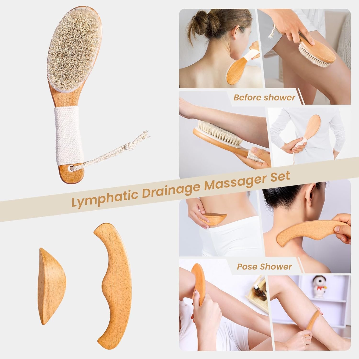 [3 in 1 Natural Set]: Elevate your at-home wellness routine with our Quick Dry Brush + Lymphatic Drainage Set! The horsehair dry brush is perfect for exfoliating dead skin cells and boosting circulation before your shower. Afterward, use the two wooden massage tools to stimulate lymphatic drainage, helping your body naturally flush out toxins and reduce fluid retention.