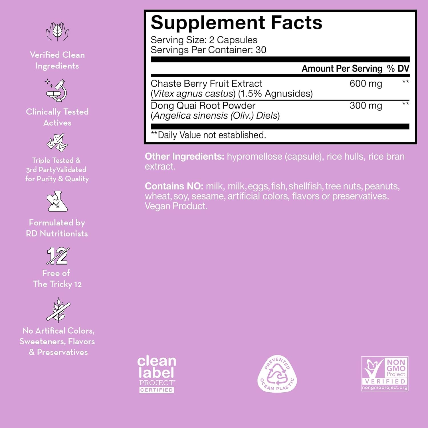 SCIENTIFICALLY BACKED INGREDIENTS: Chaste berry and dong quai root have been clinically researched and are known for their hormone-modulating properties and their ability to alleviate PMS symptoms.