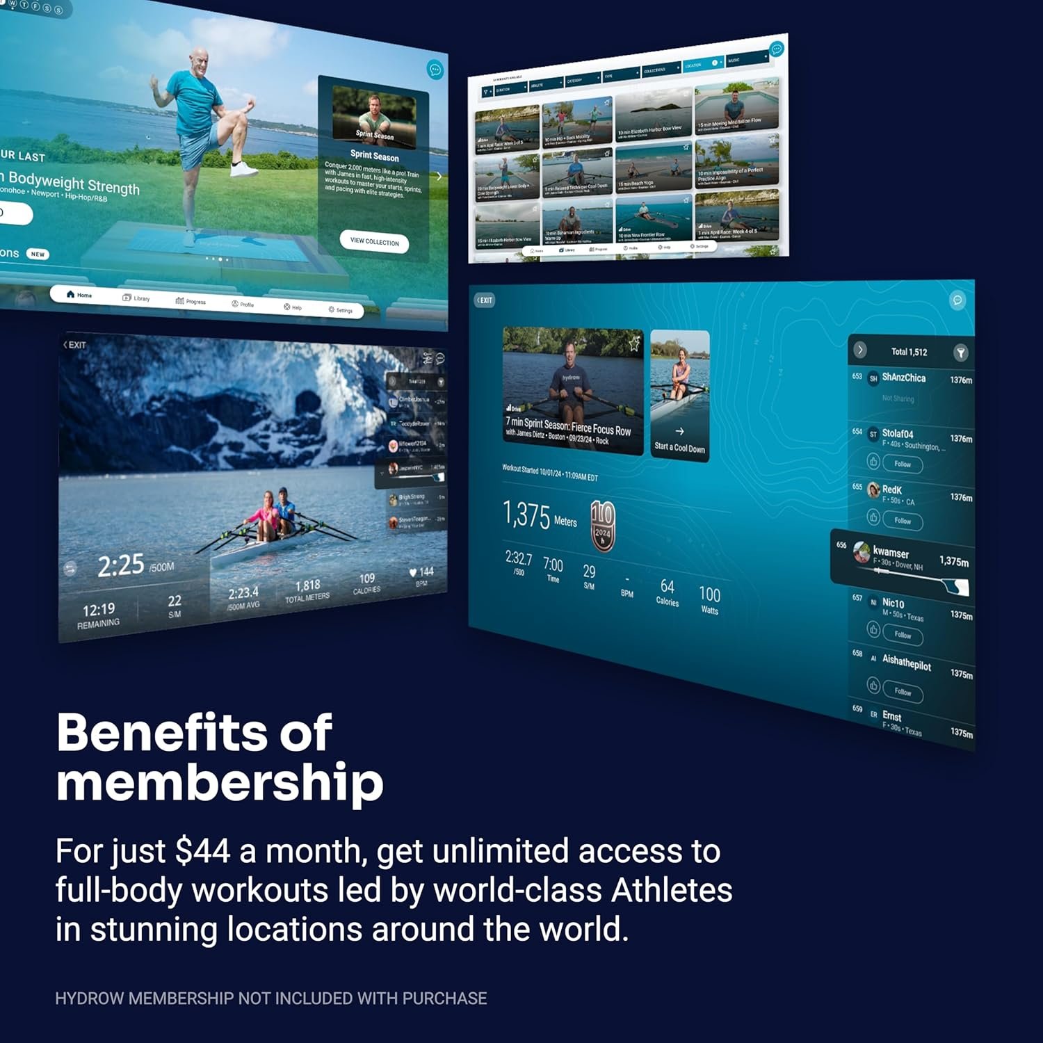 GET A MEMBERSHIP, THEN GET STARTED. For just $44/month, unlock over 5,000 at-home workouts for all fitness levels. Explore a range of workout styles, including cardio, strength, recovery, and more — all led by world-class instructors in stunning locations around the world. (NOTE: Memberships are sold separately from Hydrow machines.)