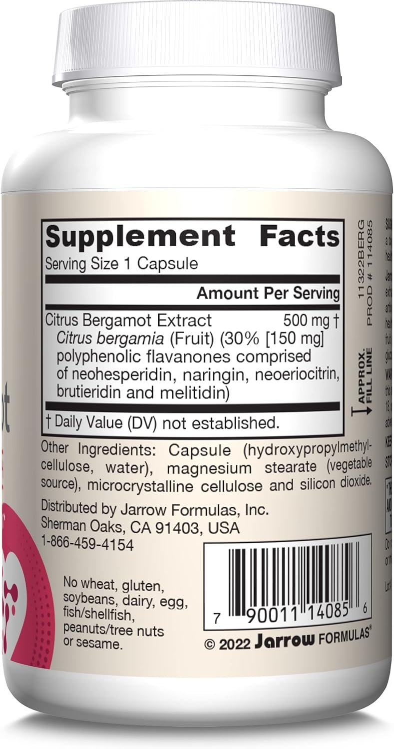 Jarrow Formulas Citrus Bergamot is a dietary supplement that harnesses the benefits of the Citrus bergamia fruit that thrives along Southern Calabria, Italy. With its abundance of naturally occurring polyphenolic antioxidants, this unique formula has been carefully crafted to support your overall well-being.* At the heart of Jarrow Formulas Citrus Bergamot lies the primary ingredient, citrus bergamia. This fruit provides polyphenols, an antioxidant. These antioxidants play a role in supporting your cells against oxidative stress.* Each serving of Jarrow Formulas Citrus Bergamot provides 500 mg of citrus bergamot extract standardized to 30 percent polyphenolic flavonones. This formula aids in supporting the cardiovascular system and metabolism.* This supplement is non-GMO, and it is vegan-friendly, aligning with a plant-based lifestyle. It is also gluten-free, catering to those individuals with dietary restrictions. Adults take 1 capsule per day on an empty stomach prior to the evening meal or as directed by your qualified healthcare professional. For best results, use in conjunction with Jarrow Formulas QH-absorb (ubiquinol). *These statements have not been evaluated by the Food and Drug Administration. This product is not intended to diagnose, treat, cure or prevent any disease.