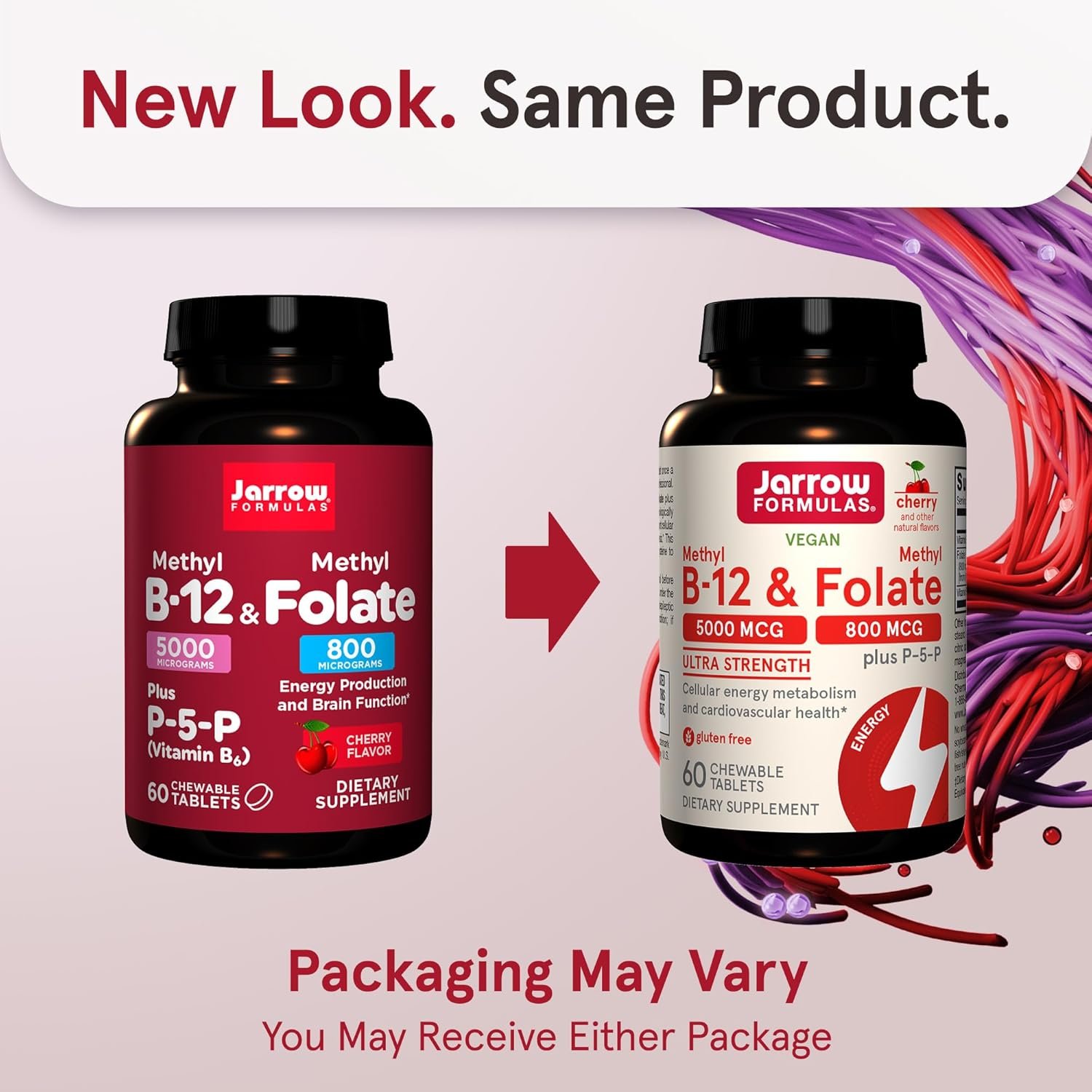 Cellular Energy Metabolism and Cardiovascular support supplement*: Contains one 60 count bottle of Jarrow Formulas Ultra Strength Methyl B-12 5000mcg & Methyl Folate 800mcg Chewable Tablets for a 60-day supply.