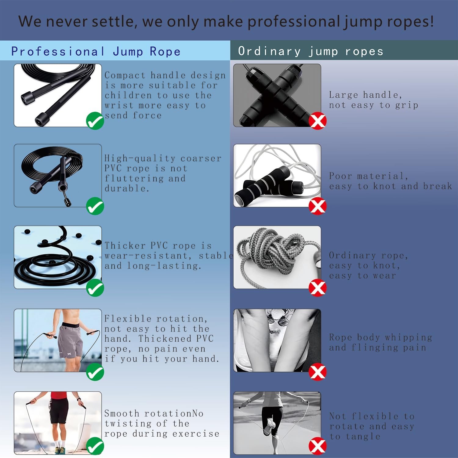 Material: Our professional jump rope series is made from a variety of combinations using Premium PVC materials, ensuring durability. Whether for daily workouts or prolonged use, these jump ropes for fitness maintain stability and sturdiness.