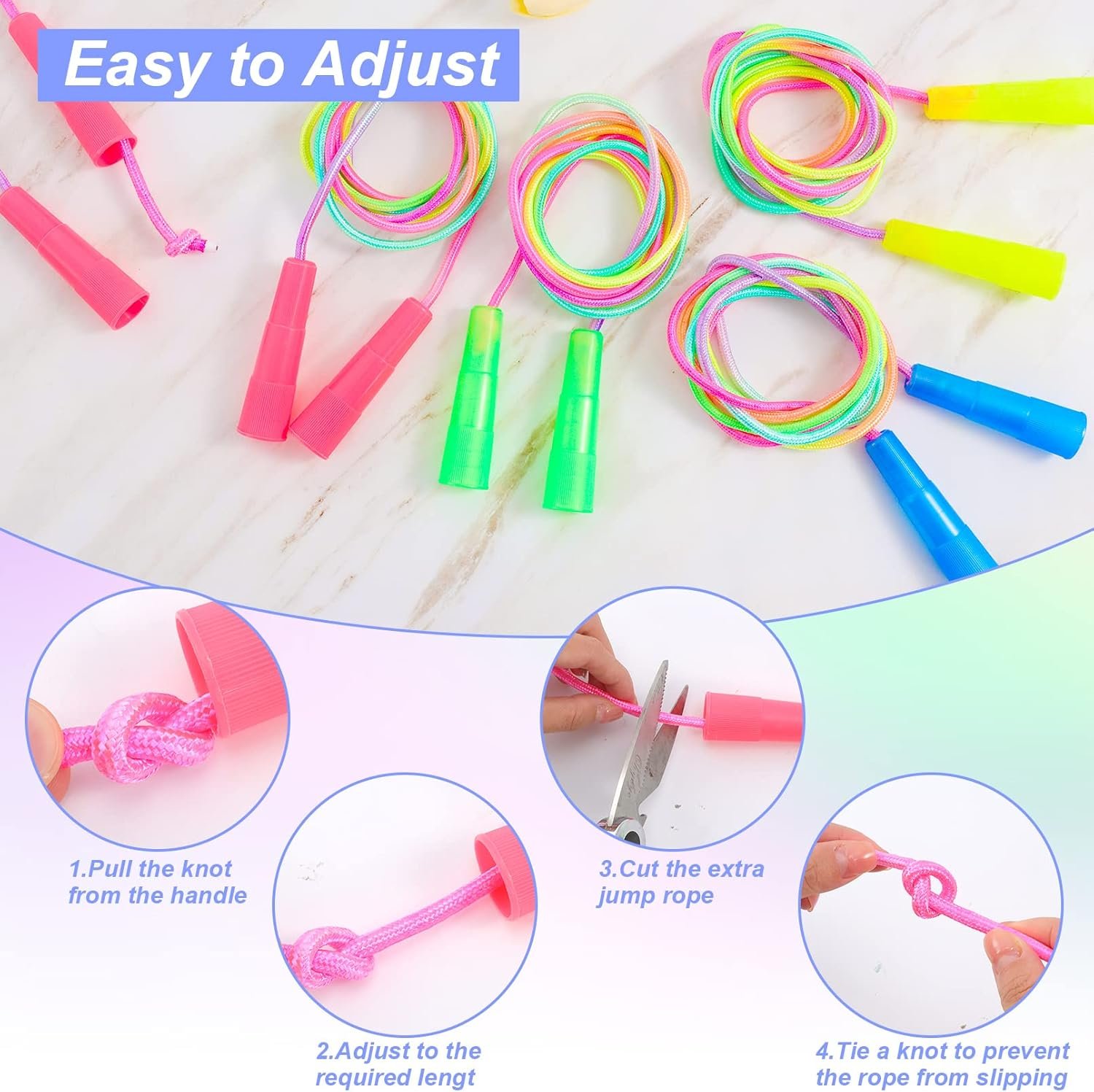 🌿Easy to Adjust the Length: These kids jump rope handle and rope are removable. Each kids jump rope is 7.2 feet long and the rope length can be adjusted according to your height. Simply re-tie the knot and cut off the excess length of rope with scissors.