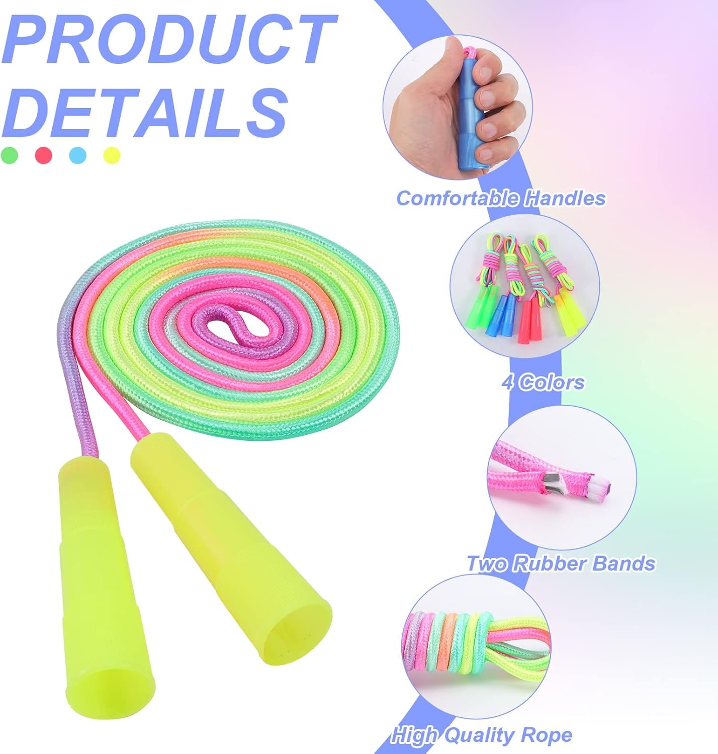 Gradient Rainbow Design: Each jump rope has a rainbow gradient braided rope. The kids skipping ropes feels like a rainbow when it crosses in the air, very cute and vivid.
