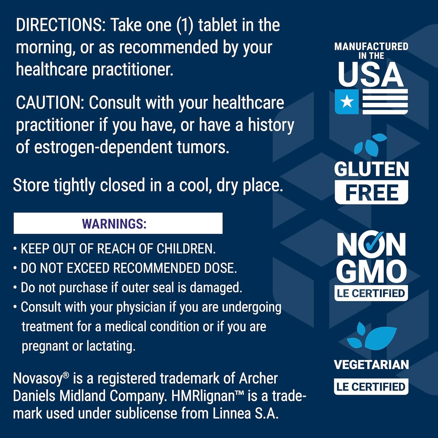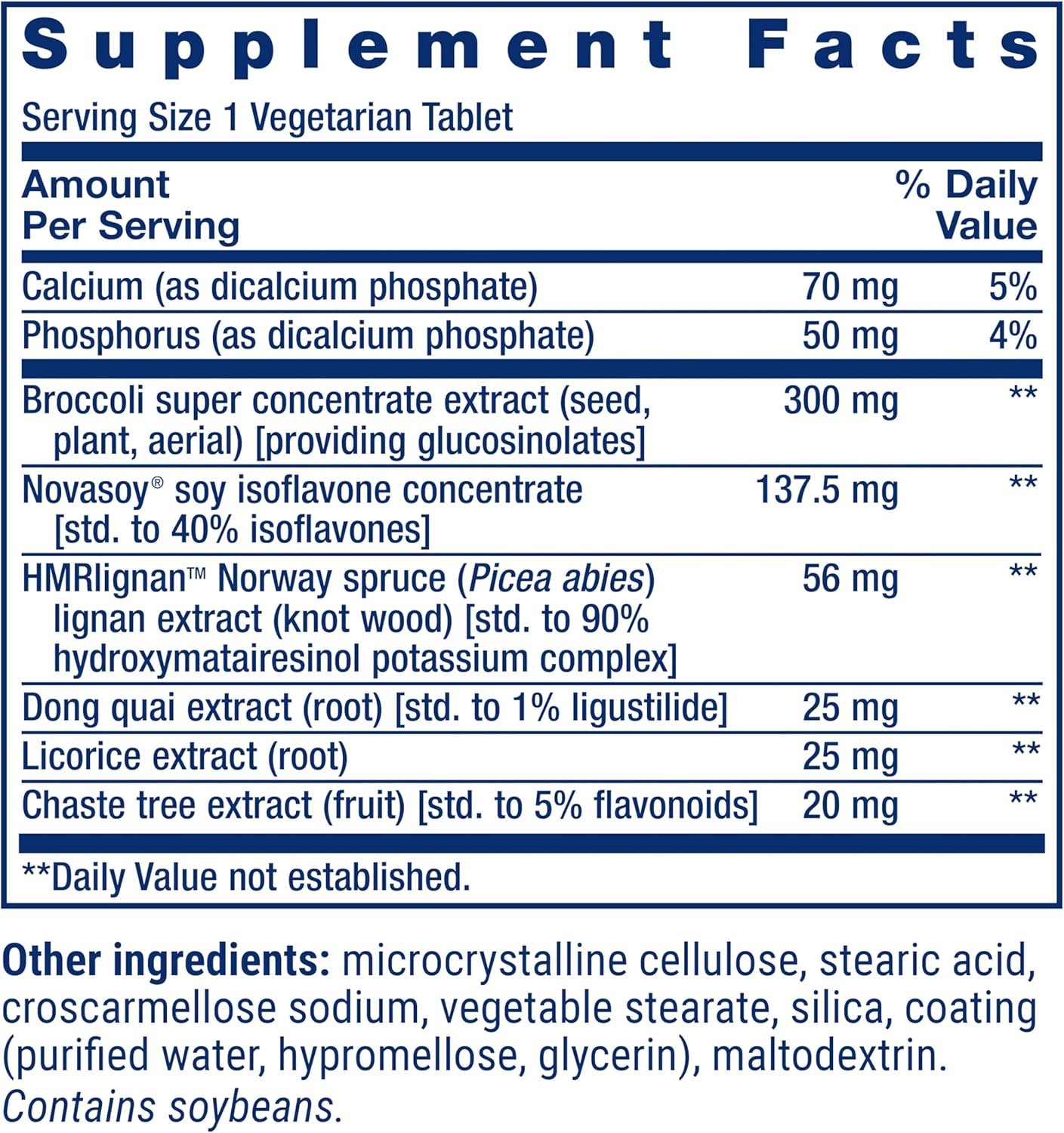 Hormone-free support — This estrogen-free vegetarian formula contains Norway spruce lignans, broccoli, licorice, dong quai and chasteberry extracts. Every bottle contains a 1-month supply.