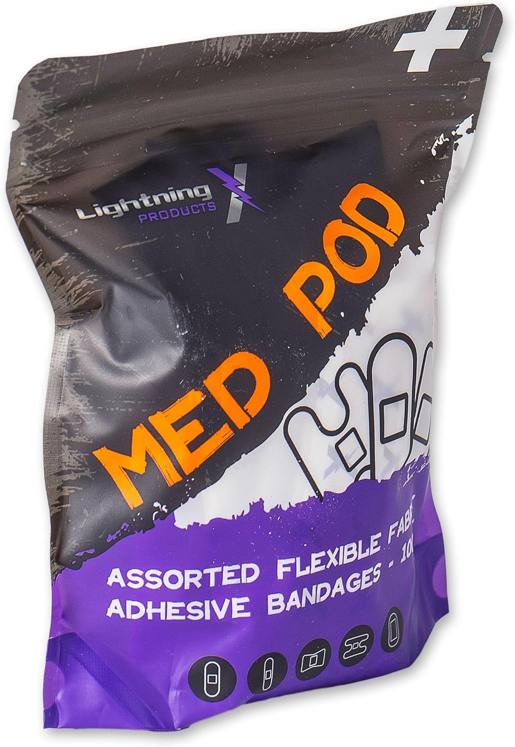 Lightning X Fabric Adhesive Bandages feature a unique woven design that stretches and adapts to your body’s movements, ensuring maximum comfort throughout the healing process. Made from a breathable cloth material, our bandages allow air to circulate, promoting faster healing of cuts, scrapes and wounds. With their four-sided seal, they effectively protect against dirt, grime and other germs. The absorbent pad attached to the bandage is designed to prevent sticking to the wound, ensuring painless removal – a necessity for applying to kids boo-boo’s. Offering long-lasting protection, these bandages stay securely in place while still being easy to remove. Each bandage is individually-wrapped and sterile, making them convenient and hygienic. Our 100-count Med Pod of Flexible Fabric Adhesive Bandages are great for first aid and wound care protection of minor wounds, cuts, scrapes and burns. These adhesive bandages make a great addition to wound care supplies and first aid kits. For proper wound care, treat with wound an antibiotic ointment such as Lightning X Triple Antibiotic Ointment prior to application of the bandage. Five assorted sizes including: Qty 70 x Standard Bandage 1″ x 3″ Qty 18 x Medium Bandage .75″ x 3″ Qty 4 x Fingertip Bandage 1.75″ x 2″ Qty 4 x Knuckle Bandage 1.5″ x 3″ Qty 4 x XL Bandage 2″ x 3.75″