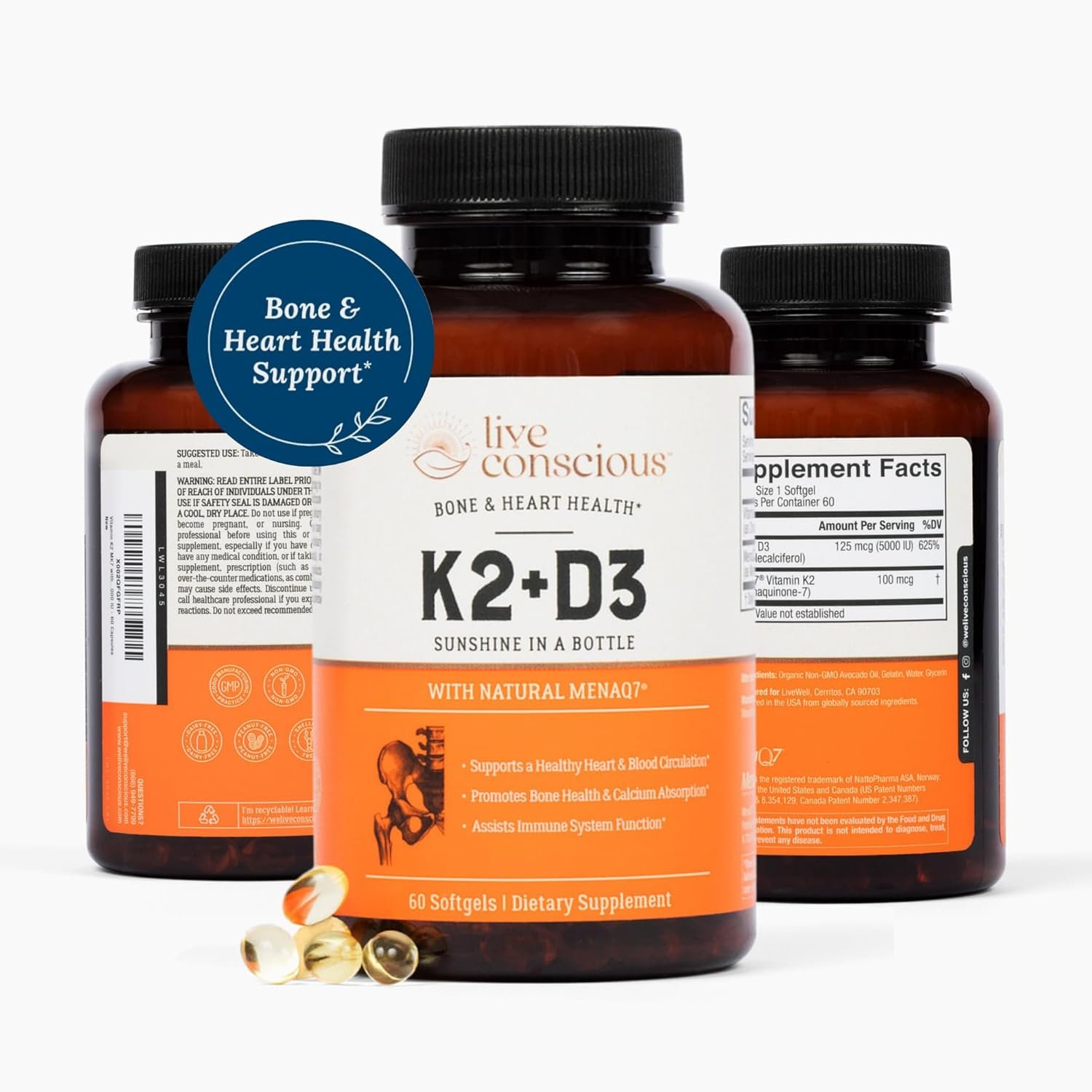 Home Wellness Wellness Supplements Live Conscious Vitamin K2 MK7 with D3 Supplement | Bone & Heart Health…