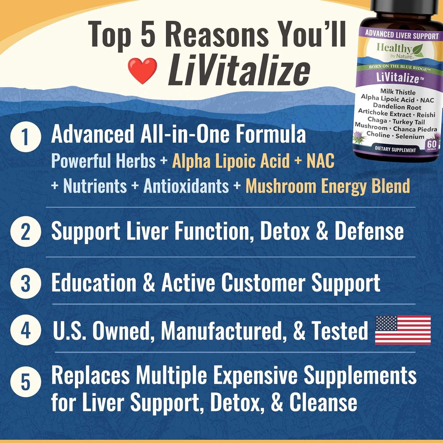ADVANCED LIVER CLEANSE DETOX & REPAIR: LiVitalize is formulated to support your liver health with traditional researched ingredients such as Silymarin Milk Thistle, Dandelion Root, Artichoke, and Chanca Piedra, and combined with key liver vitamins and nutrients such as Vitamin E, Zinc, Choline, Selenium, and L-Methionine and an advanced antioxidant and mushroom energy blend.*