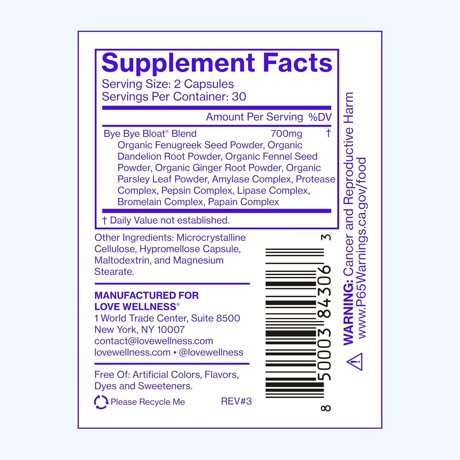 FAST & EFFECTIVE BLOATING RELIEF: Kiss digestive woes goodbye with our safe, effective blend designed to help provide bloating and gas relief and promote healthy digestion.* Digestive enzymes and herbs in Love Wellness Bye Bye Bloat support digestive health and normalized water retention.* Serving size 2 capsules, 30 servings per bottle.