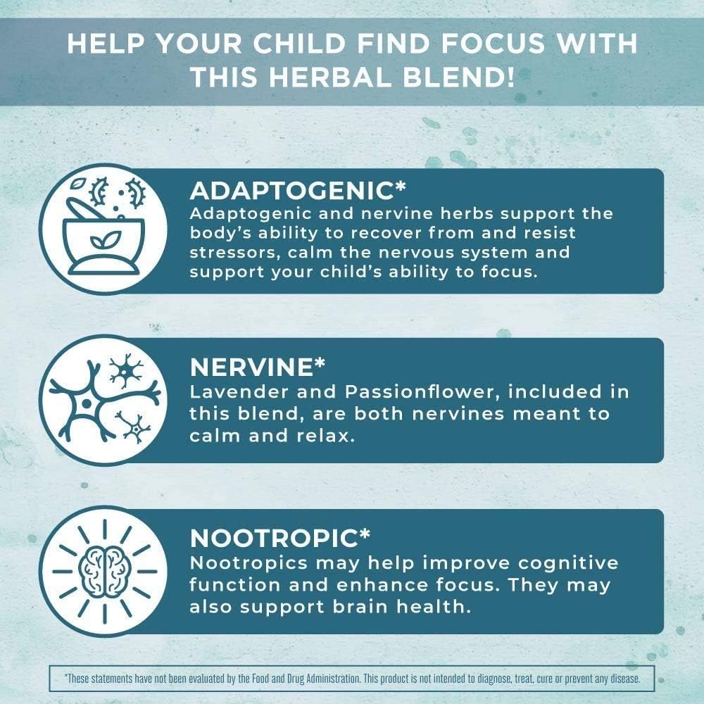 Brain Supplements for Memory and Focus: Made with Astragalus Root, Wood Betony Herb, Ginkgo Leaf, Eleuthero Root, Gotu Kola Herb, Rhodiola Root, Licorice Root, Lavender Flower, Spearmint Leaf, and Passionflower Leaf — this herbal blend is formulated for kids to support focus & attention, as well as supporting calm and relaxation.