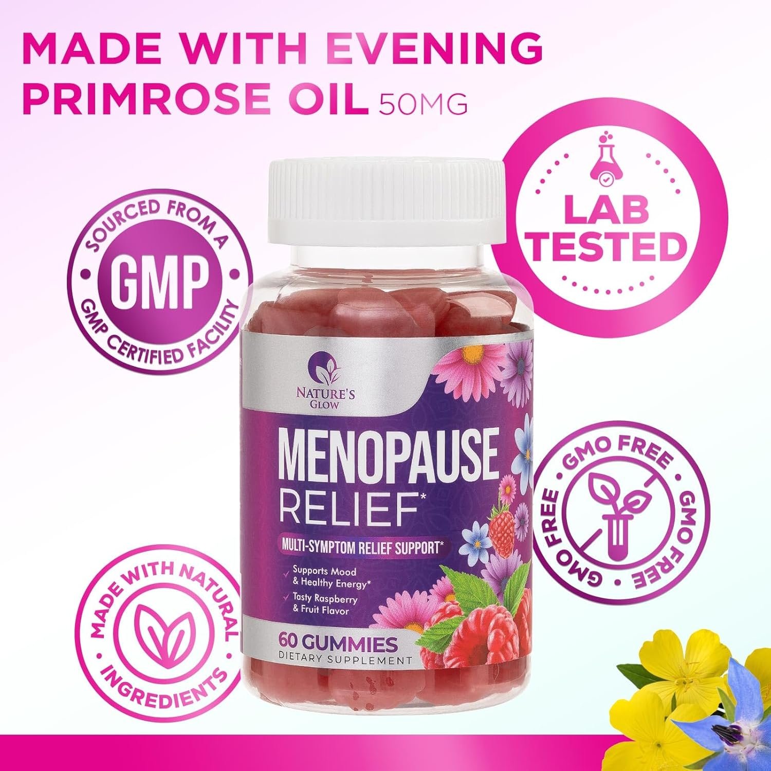 MENOPAUSE SUPPLEMENTS FOR WOMEN: Nature’s Glow Natural balance support supplement gummies with complete multi menapause relief vitamins hot flashes night sweats with no soy isoflavones black cohosh dim pills and tablets pre menopausal perimenopause premenopausal energy hot flash inner glow support happy la menopausia para mujer