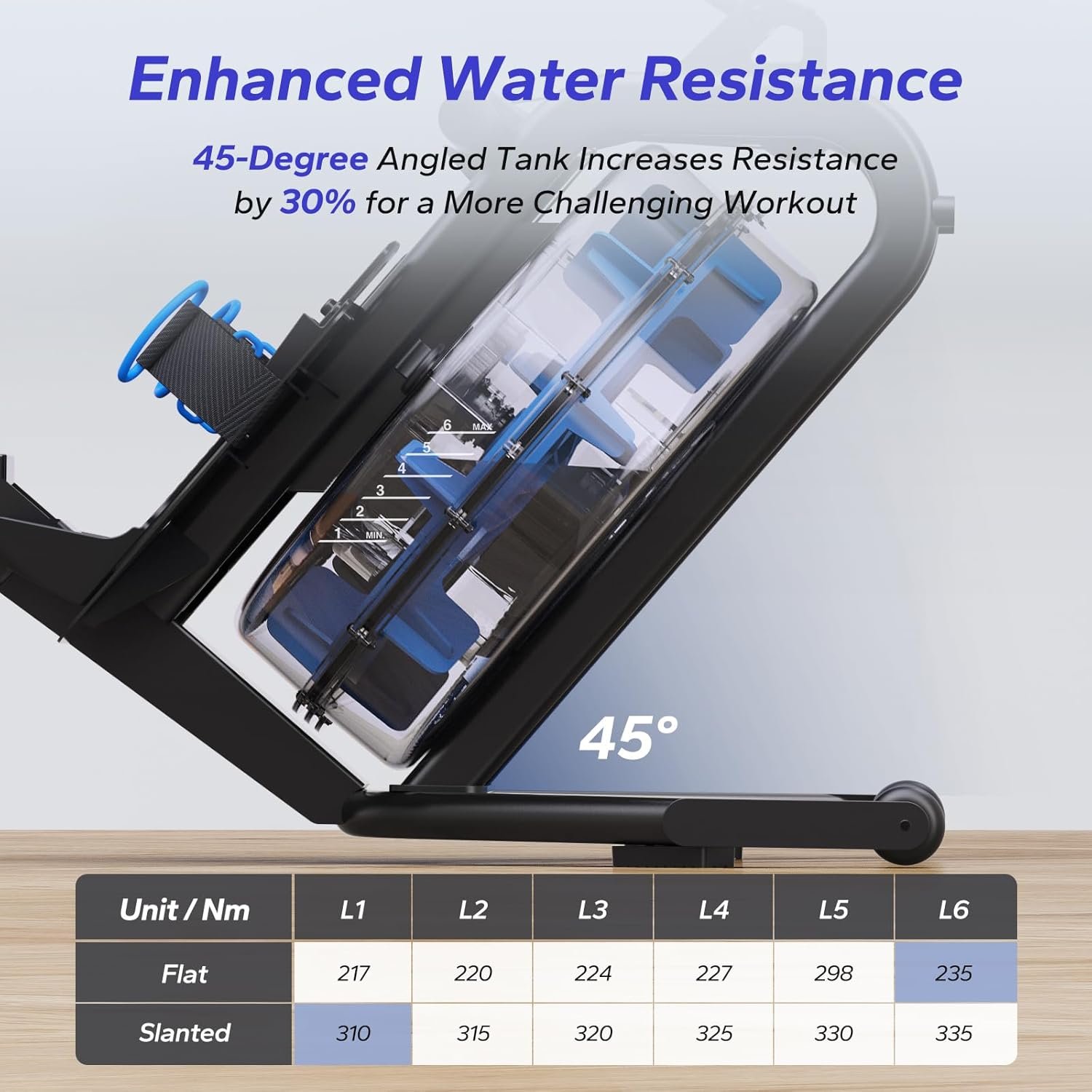 Water Resistance Upgrade: Traditional water rower upgraded with a 45-degree angled 15L large-capacity polycarbonate water tank. Increases resistance by 30%, leak-proof, and impact-resistant for a more stable rowing experience.