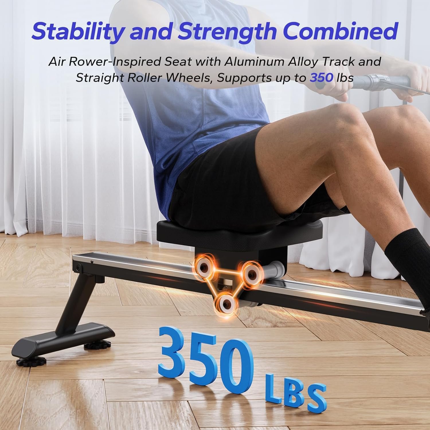 Stable Design: Features cylindrical roller seat rail system from air resistance rowing machines and upgraded extended reinforced aluminum alloy rails. Accommodates users from 1.2 to 2 meters tall and supports up to 350 lbs, ensuring stability and durability.