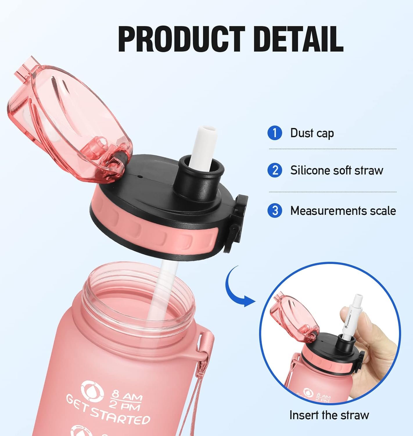 Versatile Design-Featured with a soft removable straw and a fruit strainer, giving you the option to use it with a straw or a strainer. The straw is perfect for spill-proof sipping on smoothies or cold beverages, while the strainer is great for infusing your water with fruit or tea.