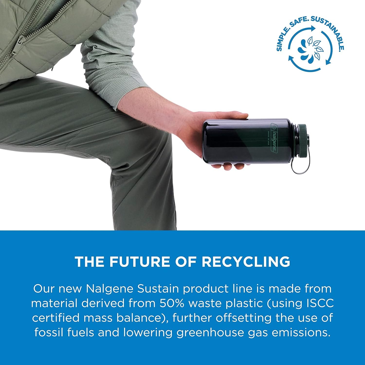 THE FUTURE OF RECYCLING: Our new Nalgene Sustain product line is made from material derived from 50% waste plastic (using ISCC certified mass balance), further offsetting the use of fossil fuels and lowering greenhouse gas emissions
