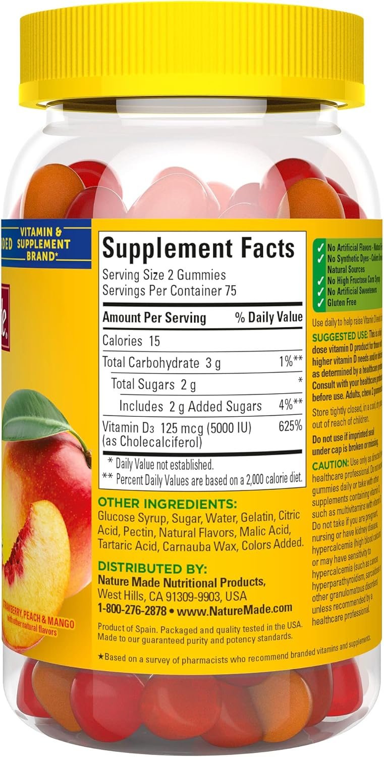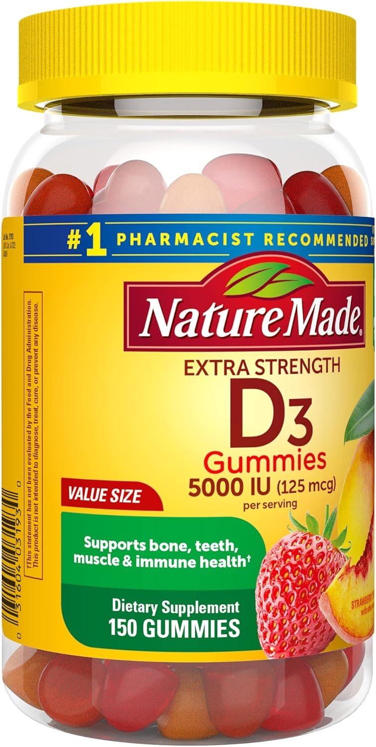 Immune, muscle, teeth and bone health support supplement: contains one 150 count bottle of Nature Made Extra Strength Vitamin D3 5000 IU (125 mcg) per serving Gummies for a 75-day supply