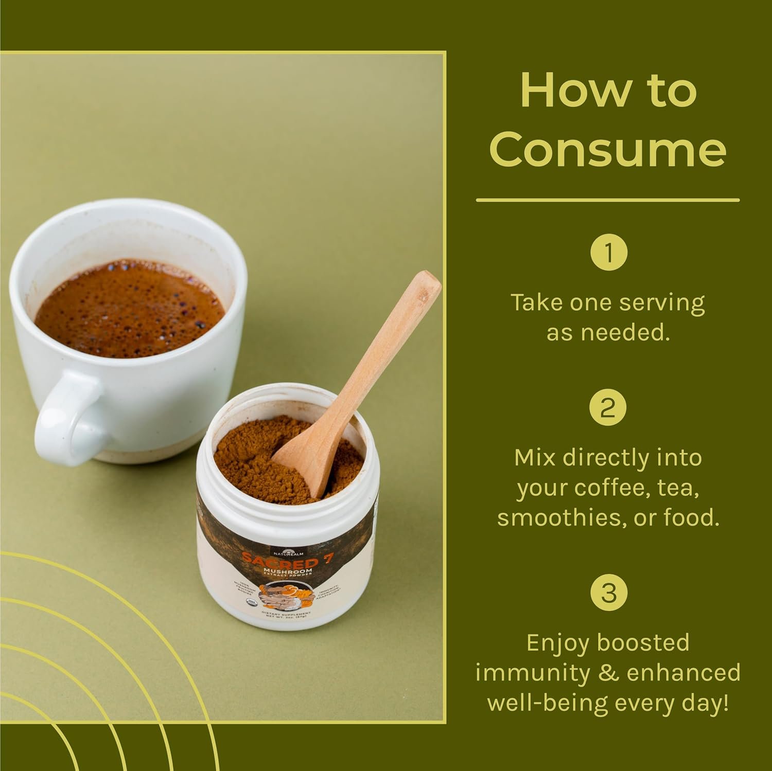 PREMIUM ABSORPTION: Add a scoop (½ tsp / 1g) of Sacred 7 to your coffee, tea, oatmeal, or protein drink. Our finely ground powder easily dissolves in cold and hot liquids. Our hot water extraction process breaks down the mushrooms’ cell walls to optimize the bioavailable of beneficial compounds—yielding nutrient-dense mushrooms with high beta-glucan content.