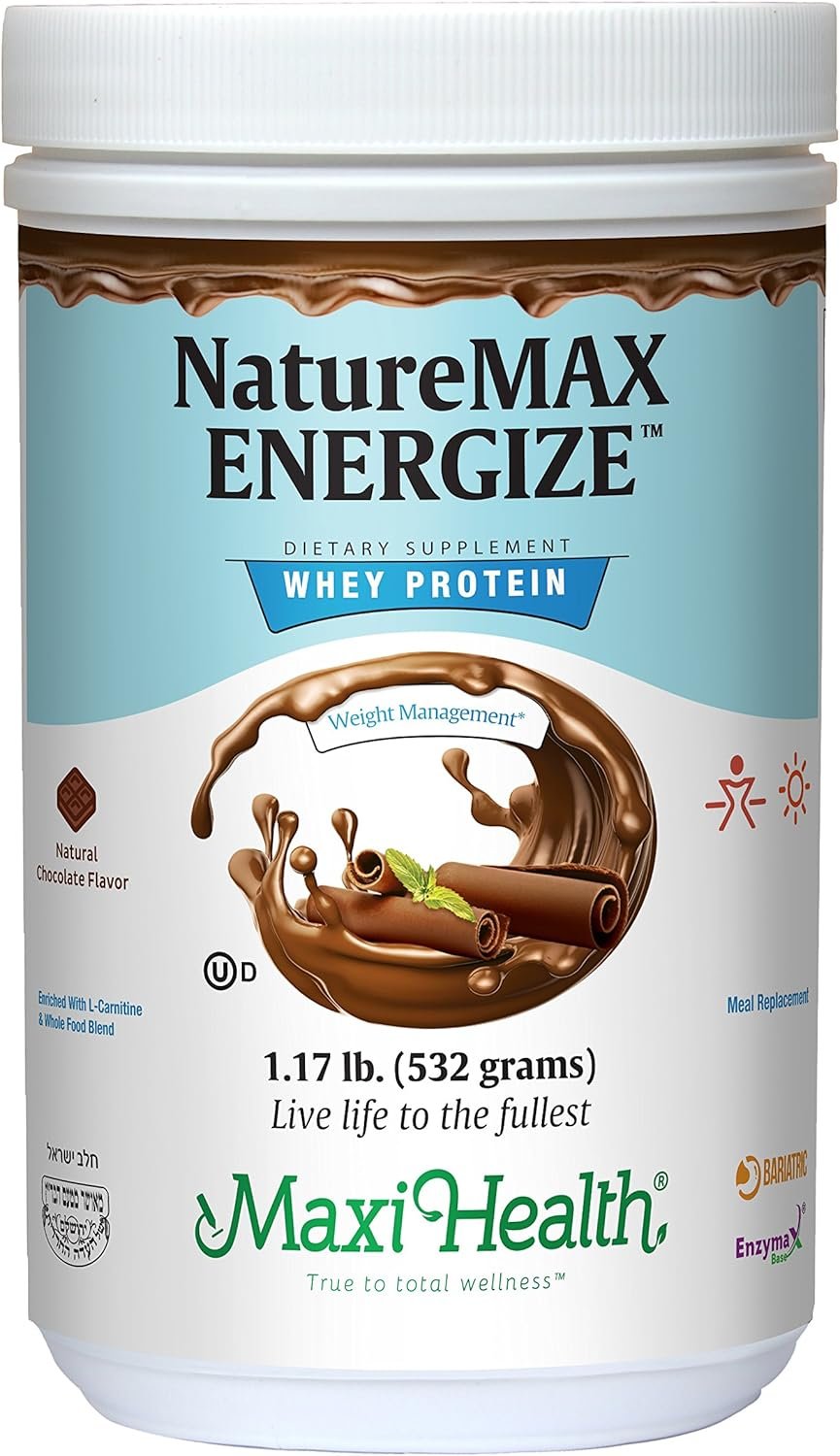 Boost your protein levels and maintain your overall health Protein is a macronutrient that is essential to building muscle mass. Few nutrients are as important as protein, and if you don’t get a sufficient amount through your diet your health and body composition will suffer. A protein drink will boost your daily protein intake and help keep you active and supple. NatureMax EnergizeTM is a creamy rich natural chocolate flavored, delicious, easily digestible whey protein drink, supplying you with ibers, enzymes, amino acids, vitamins, essential minerals and powerful antioxidants. Check out the directions and supplement-facts tab for yourself. Product Details: For weight management and energy supplement Manufactured in a GMP Certi ied Facility 16 servings per container Volume: 1.13 lbs. (511 grams) Gluten and wheat free Easy to prepare Satisfaction guaranteed or 30-day money back Maintain proper protein levels with Maxi-Health Whey Protein Powder by clicking ‘Add to Cart’ above and get an energizing, easy-to-prepare protein boost. It’s that easy.