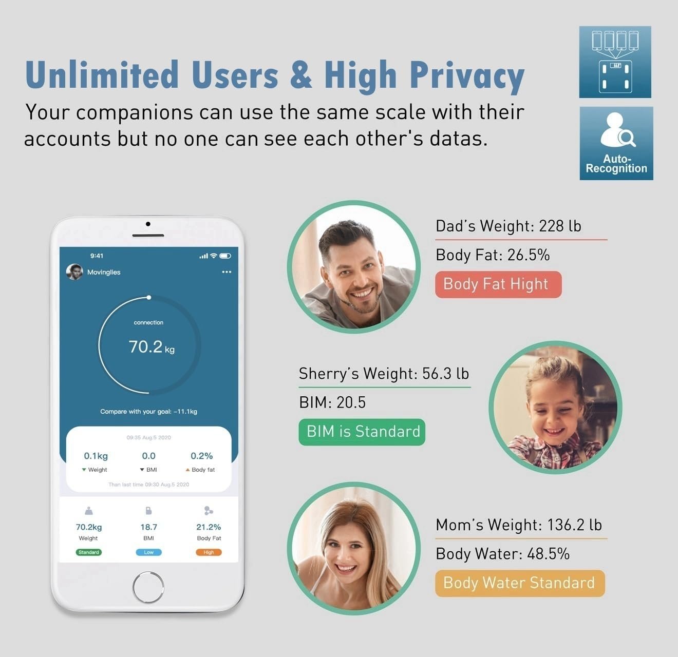 【Support Unlimited Users】 Allows your families to share one scale together via their own mobile devices while the data was stored ONLY in their mobile. 4 high precision sensitive electrodes, step on technology, auto-calibration, low fat and high fat Indication.